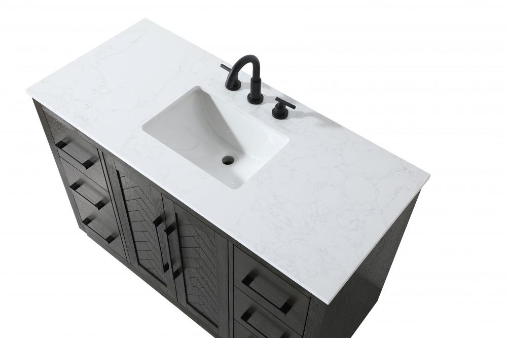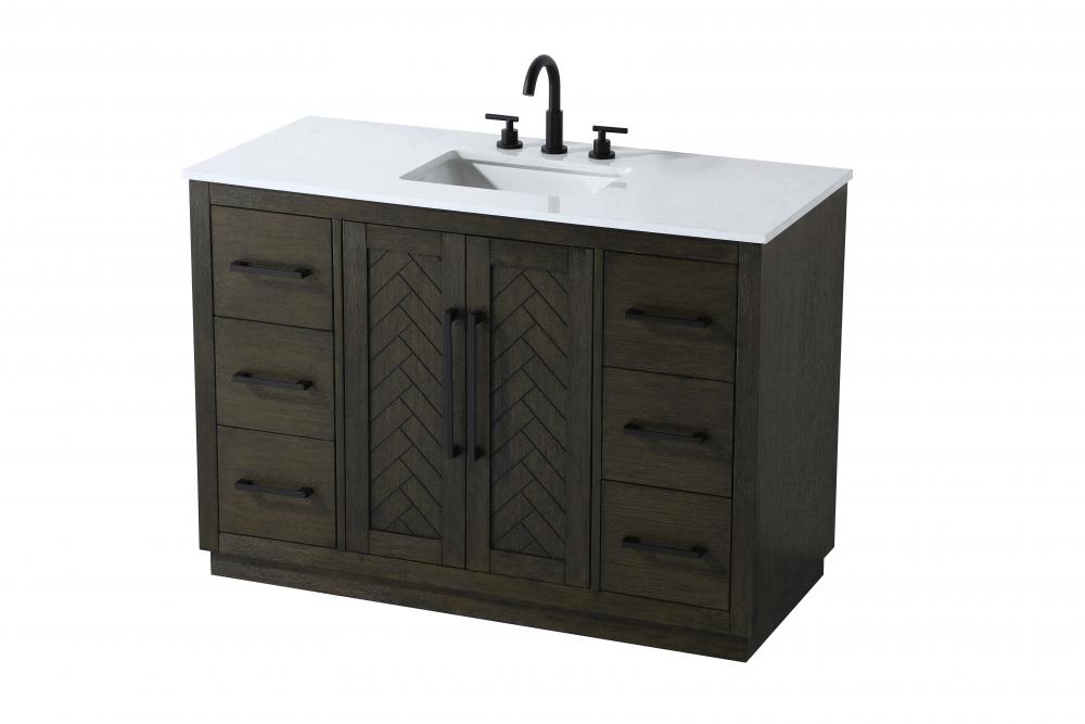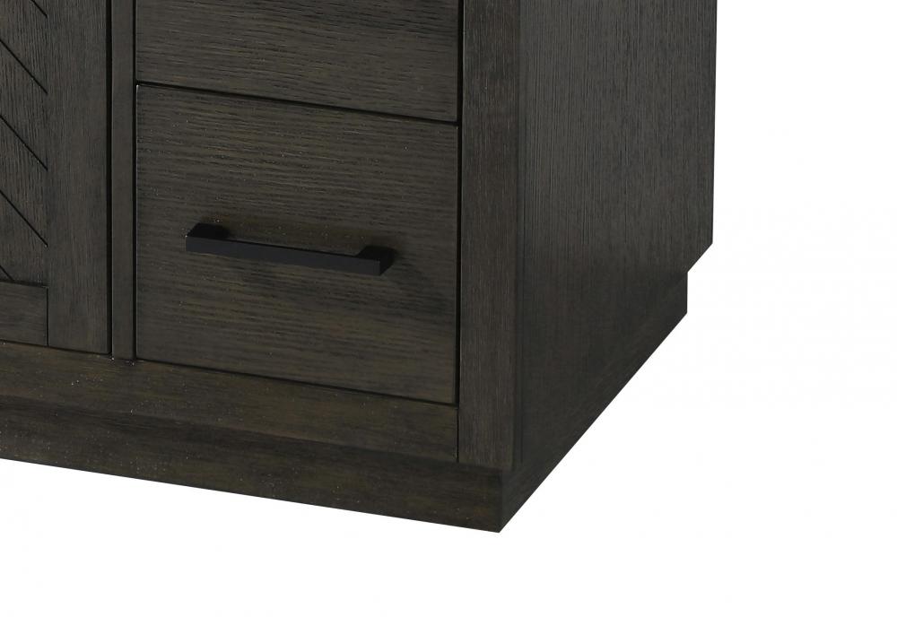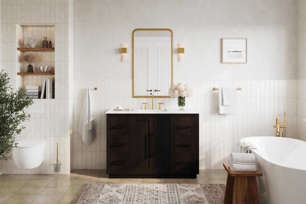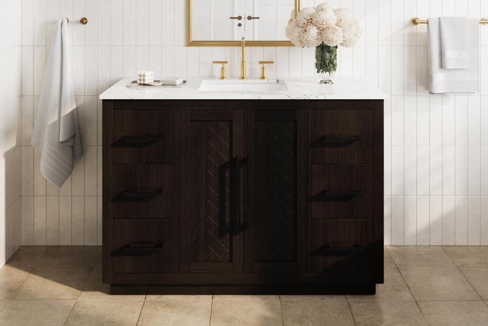 Each finish enhances the unique herringbone design on the Shaker-style door panels, adding a touch of craftsmanship and texture that elevates the overall design of the vanity.