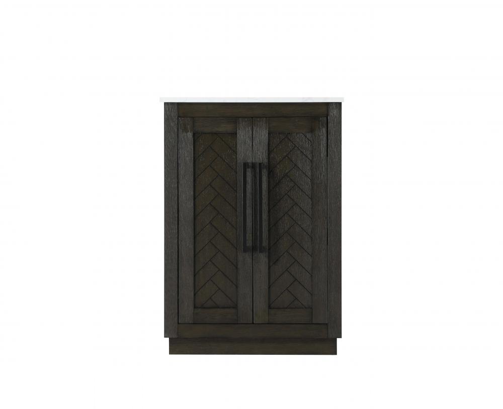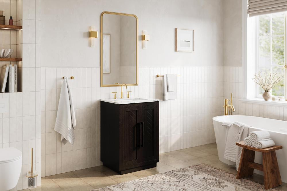 Each finish enhances the unique herringbone design on the Shaker-style door panels, adding a touch of craftsmanship and texture that elevates the overall design of the vanity.