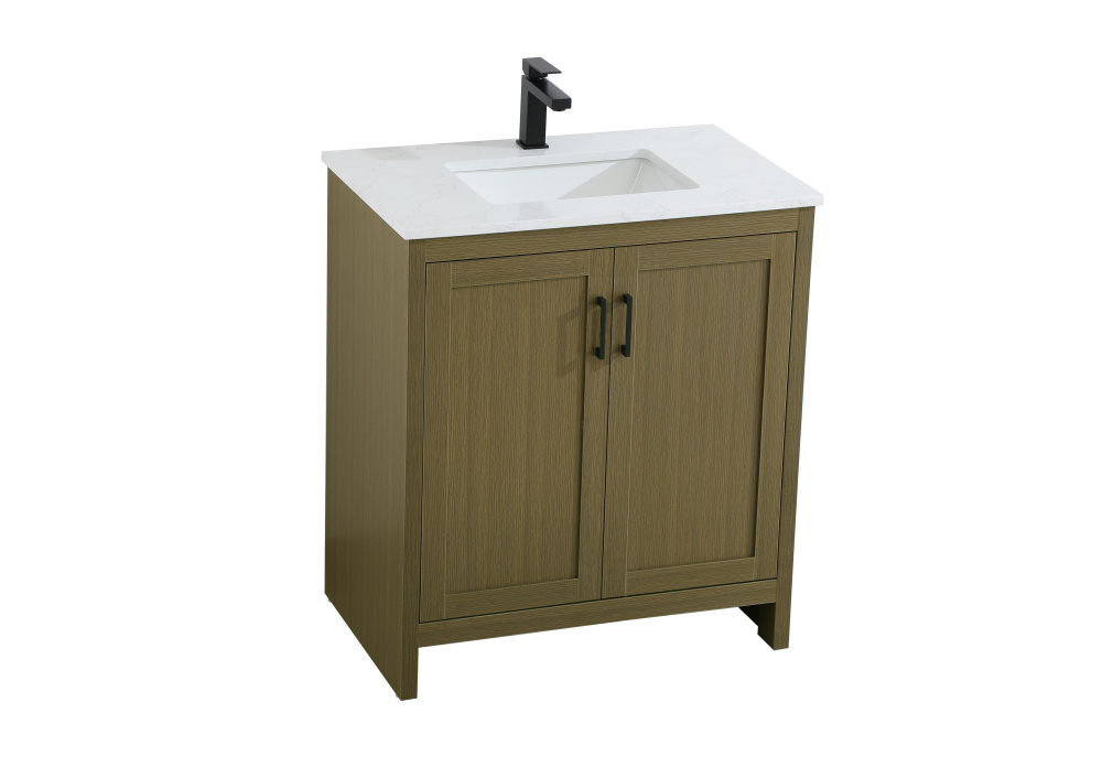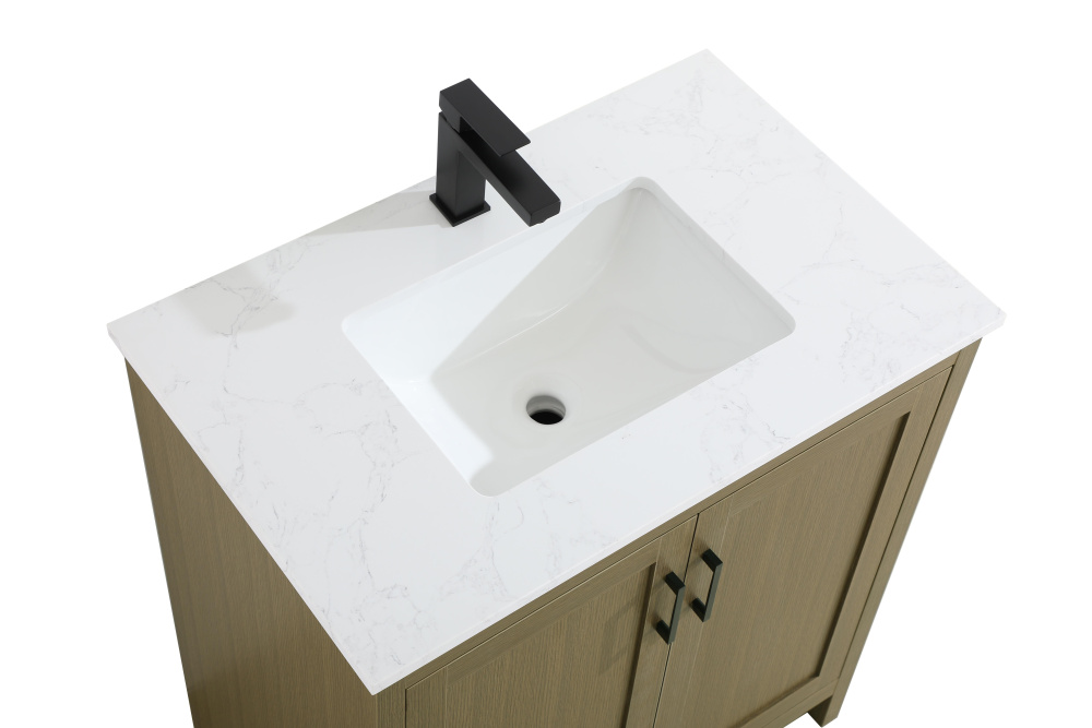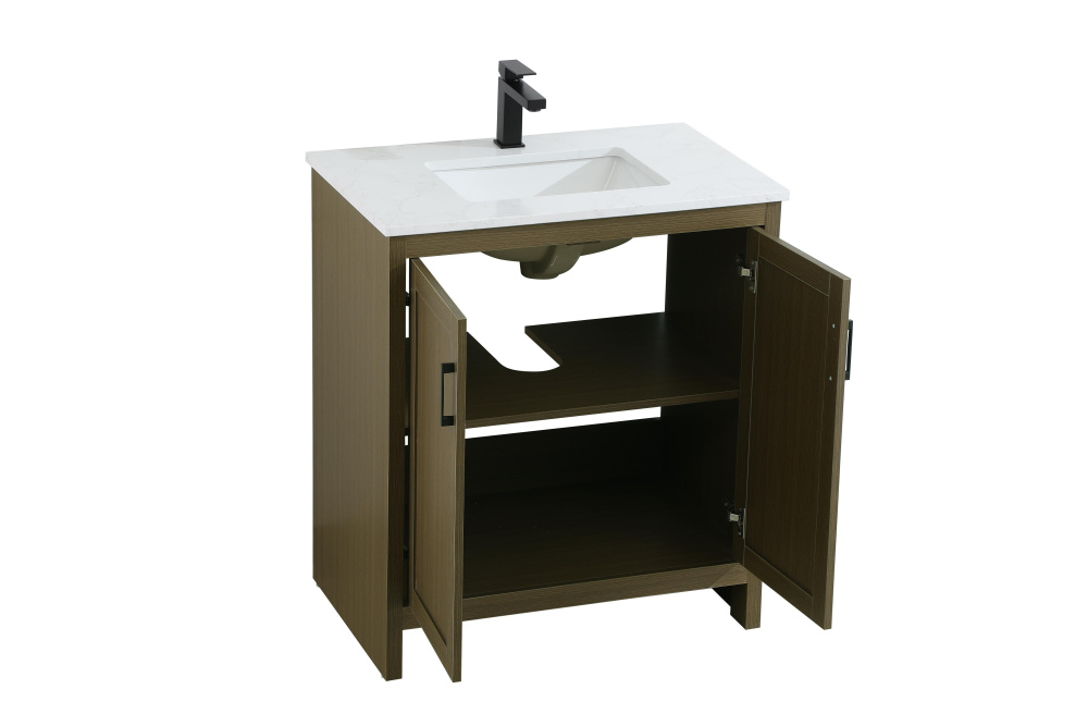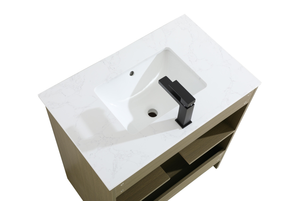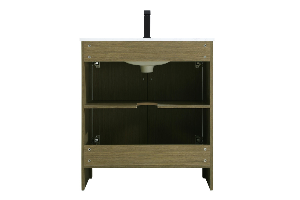 Redefine your bathroom with this transitional shaker-style vanity, designed to combine practicality with timeless aesthetics. Its clean lines and shaker-style door panels create a versatile look that complements both traditional and contemporary spaces. The engineered marble countertop, featuring a unique faux marbled pattern, adds a sophisticated focal point, while the integrated porcelain sink ensures durability and easy maintenance. The vanity includes a shelf with a smart U-shaped cutout, optimizing storage while accommodating plumbing. Crafted from sturdy MDF with a warm woodgrain finish, it brings a natural and inviting feel to your bathroom. Equipped with adjustable foot levelers for stability and a pre-drilled faucet hole for quick installation, this compact vanity delivers on both style and function. Best of all, it arrives fully assembled, ready to enhance your space right out of the box.