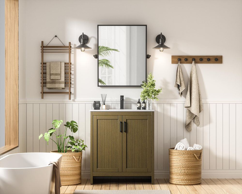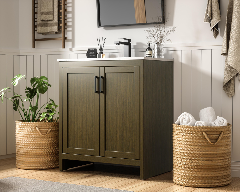 A natural wood-inspired finish adds warmth and texture to your bathroom.