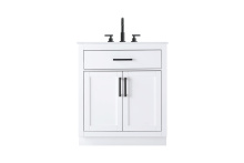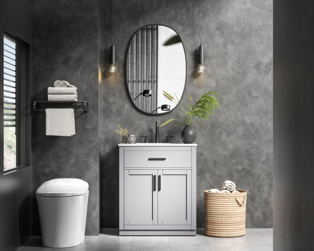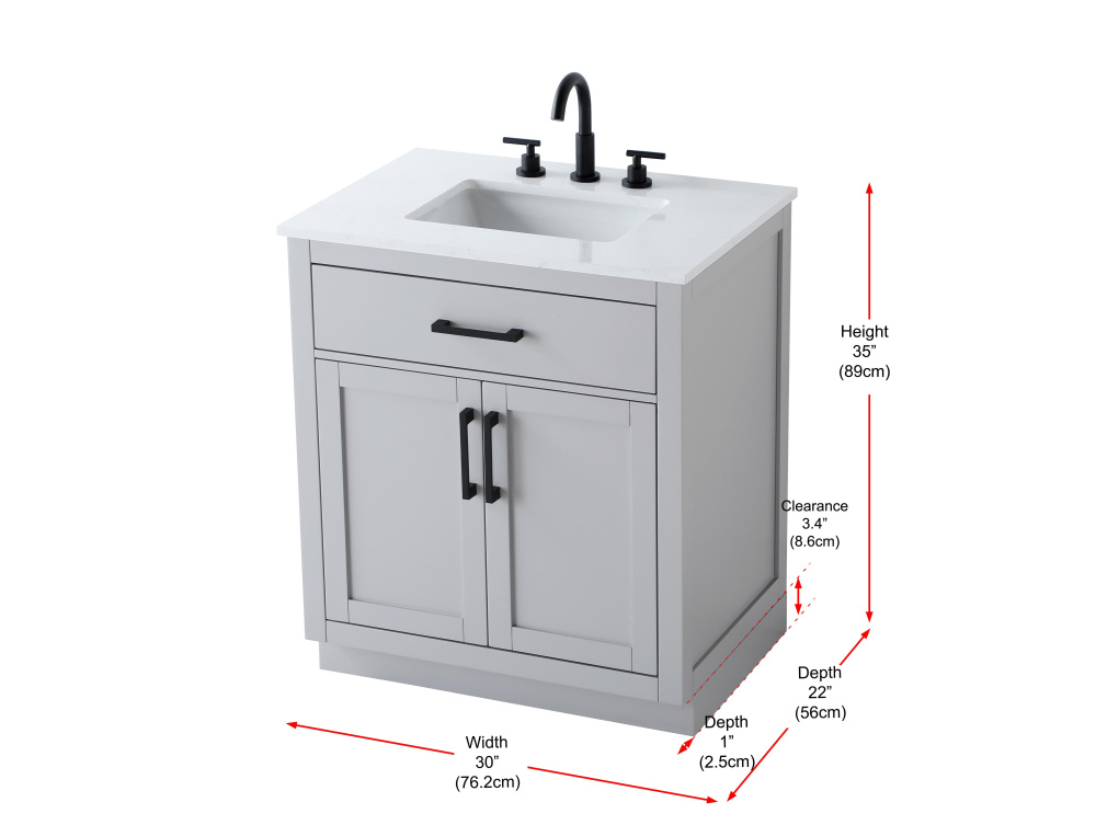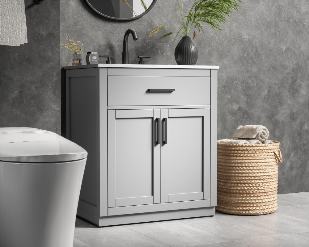 Introduce a perfect balance of functionality and style to your bathroom with this thoughtfully designed vanity. Constructed with a combination of solid wood and MDF, it offers durability and a sturdy build. The sleek engineered marble countertop with subtle grey marbling complements the rustic wood grain finish, creating a stylish and inviting centerpiece for your bathroom. Designed in a contemporary style with a transitional flair, it features a U-shaped shelf for seamless plumbing integration and multiple soft-close drawers for clutter-free organization. A pull-down drawer enhances convenience, while the toe kick adds a refined, clean-lined appearance and simplifies cleaning underneath. Matte black hardware contrasts beautifully with the cabinet finish, tying the look together. Delivered fully assembled and equipped with foot levelers, this vanity combines practicality and aesthetic appeal to suit modern and transitional bathrooms alike.