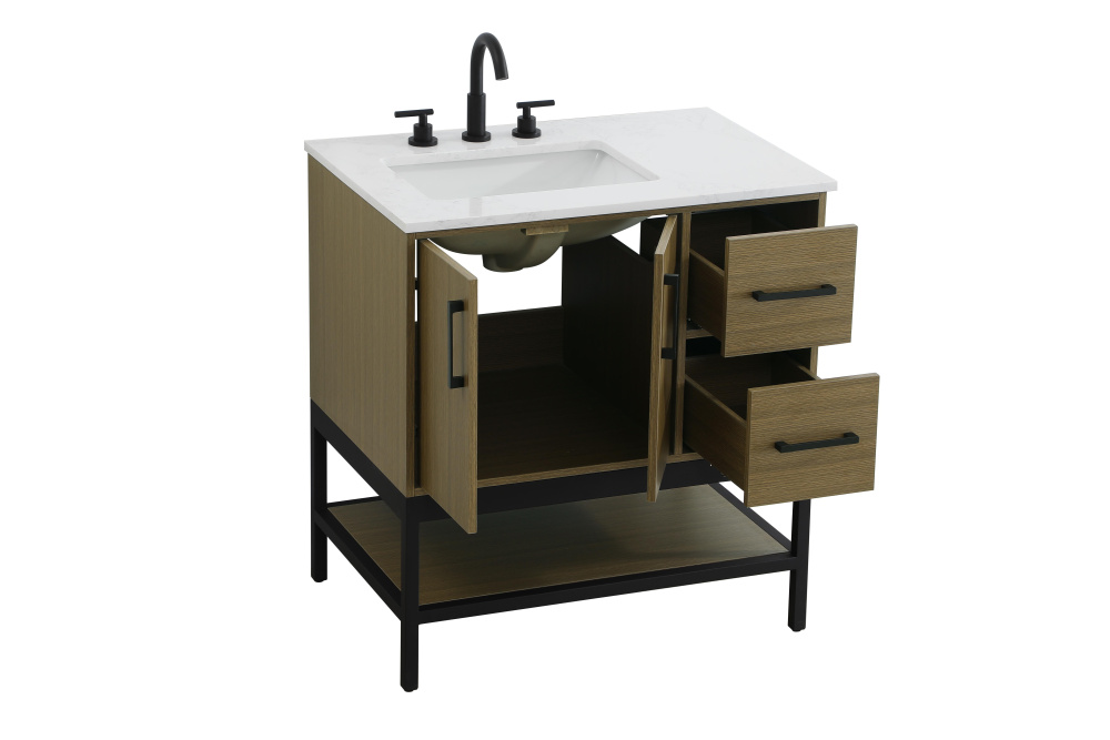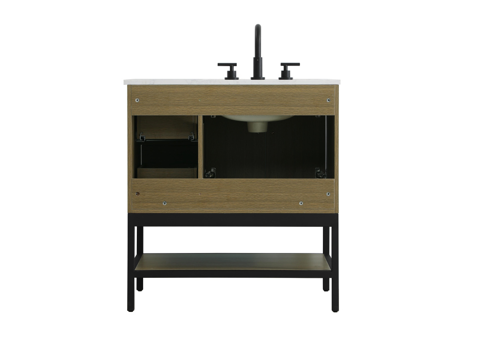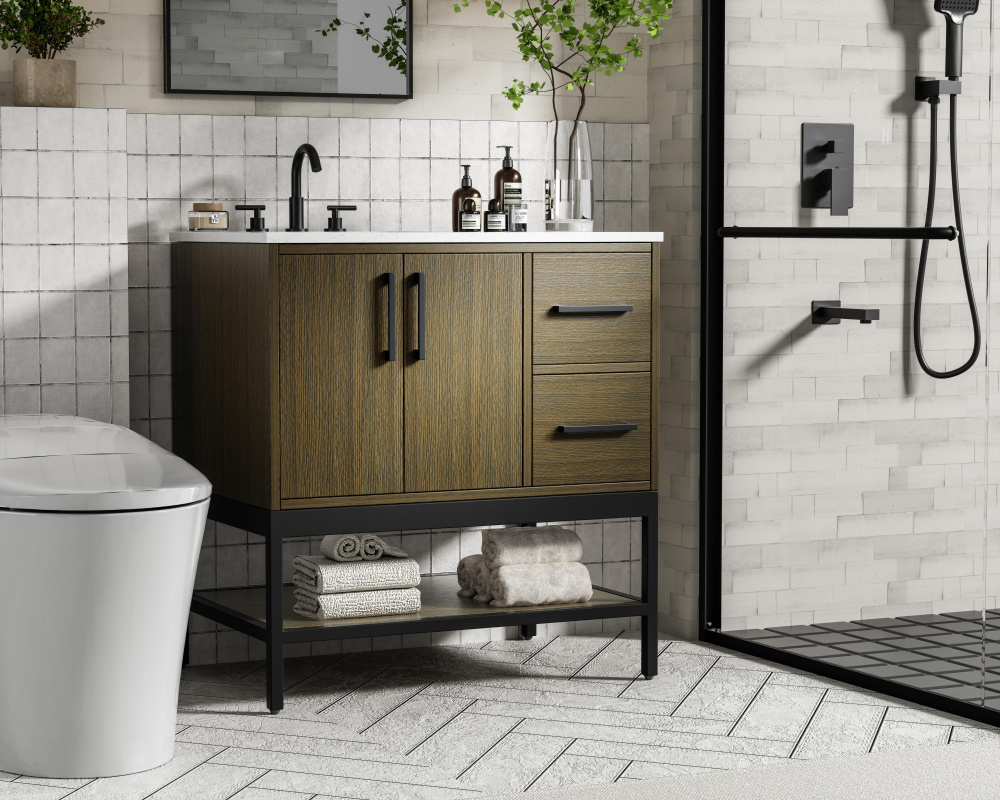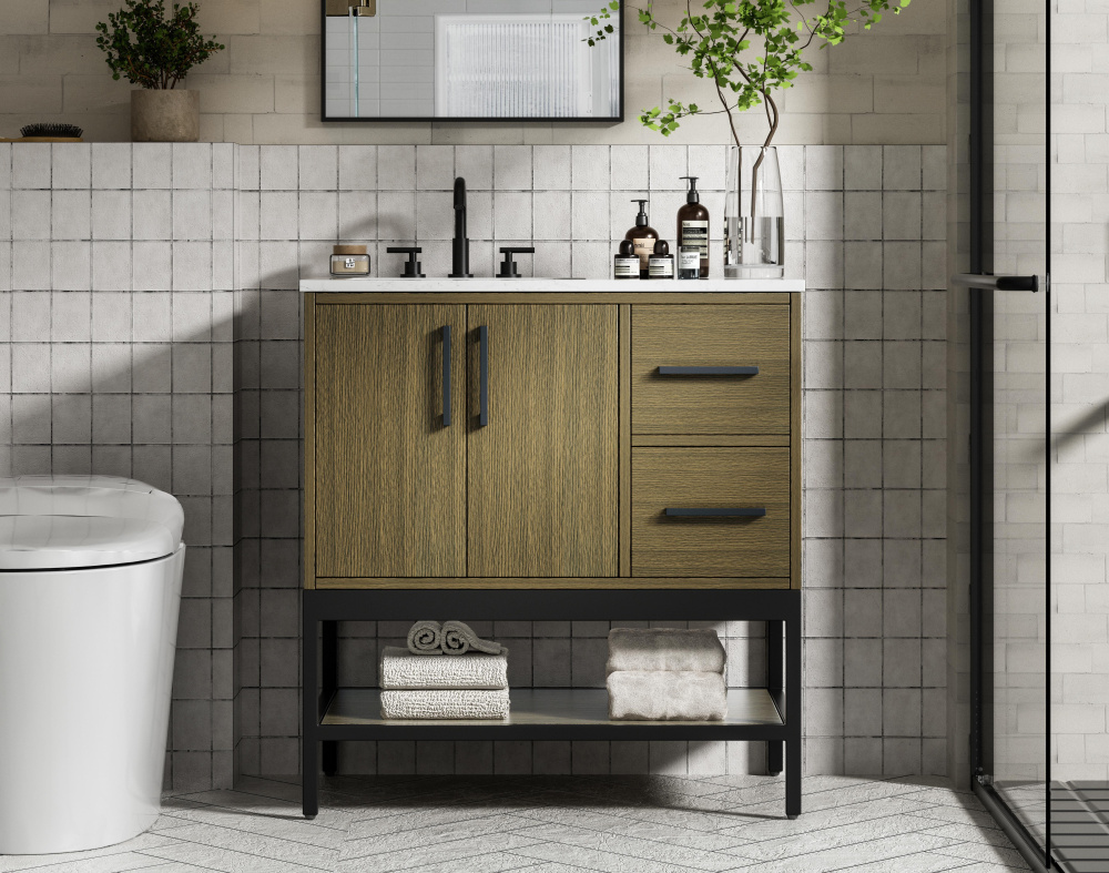 Upgrade your bathroom with this modern bathroom vanity that combines form and function effortlessly. Its sleek wood veneer cabinetry, paired with a bold black metal frame, brings a clean, contemporary vibe to any space. Designed with practicality in mind, the cabinet organizes your essentials, as well as an open lower shelf for added storage or display. The durable engineered marble countertop is built to withstand daily use, while the undermount porcelain sink ensures easy maintenance. Complete with matte black hardware and pre-drilled features for effortless installation, this vanity is the perfect centerpiece to refresh your bathroom with style and efficiency.