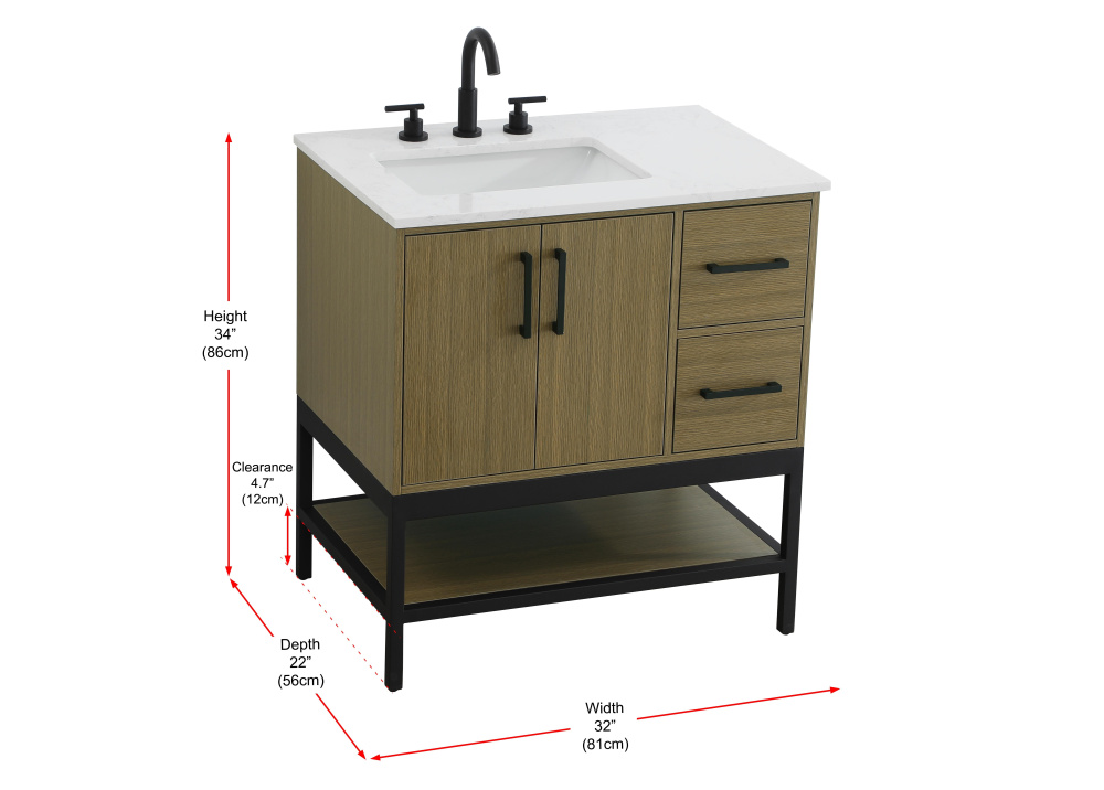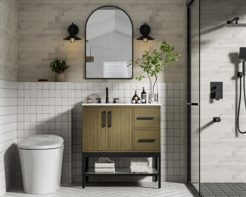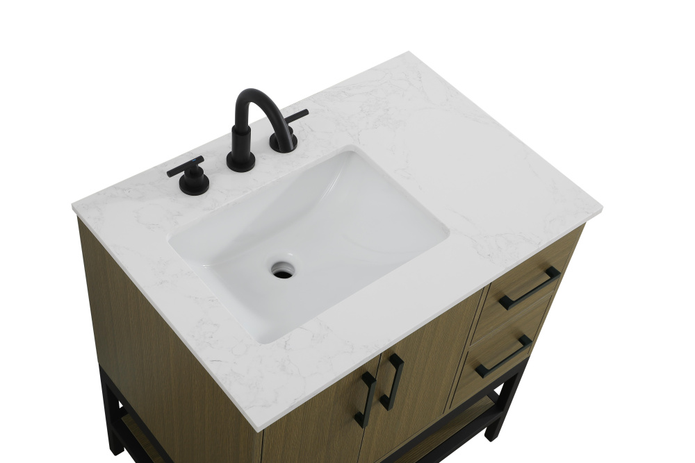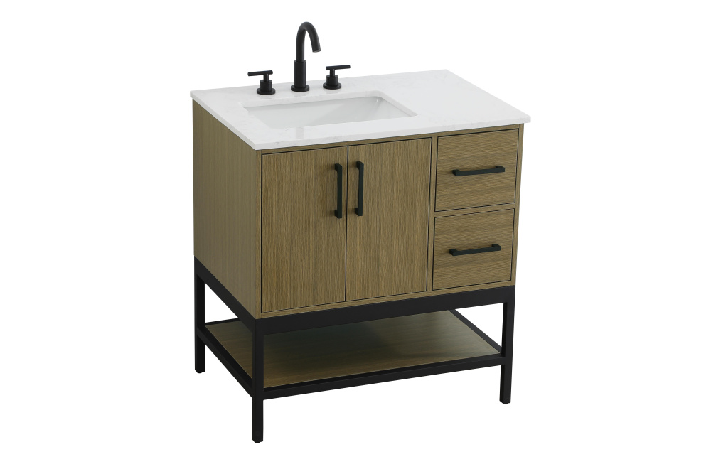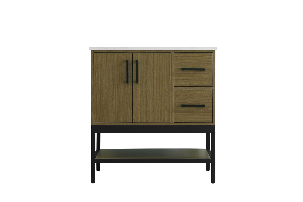 Upgrade your bathroom with this modern bathroom vanity that combines form and function effortlessly. Its sleek wood veneer cabinetry, paired with a bold black metal frame, brings a clean, contemporary vibe to any space. Designed with practicality in mind, the cabinet organizes your essentials, as well as an open lower shelf for added storage or display. The durable engineered marble countertop is built to withstand daily use, while the undermount porcelain sink ensures easy maintenance. Complete with matte black hardware and pre-drilled features for effortless installation, this vanity is the perfect centerpiece to refresh your bathroom with style and efficiency.