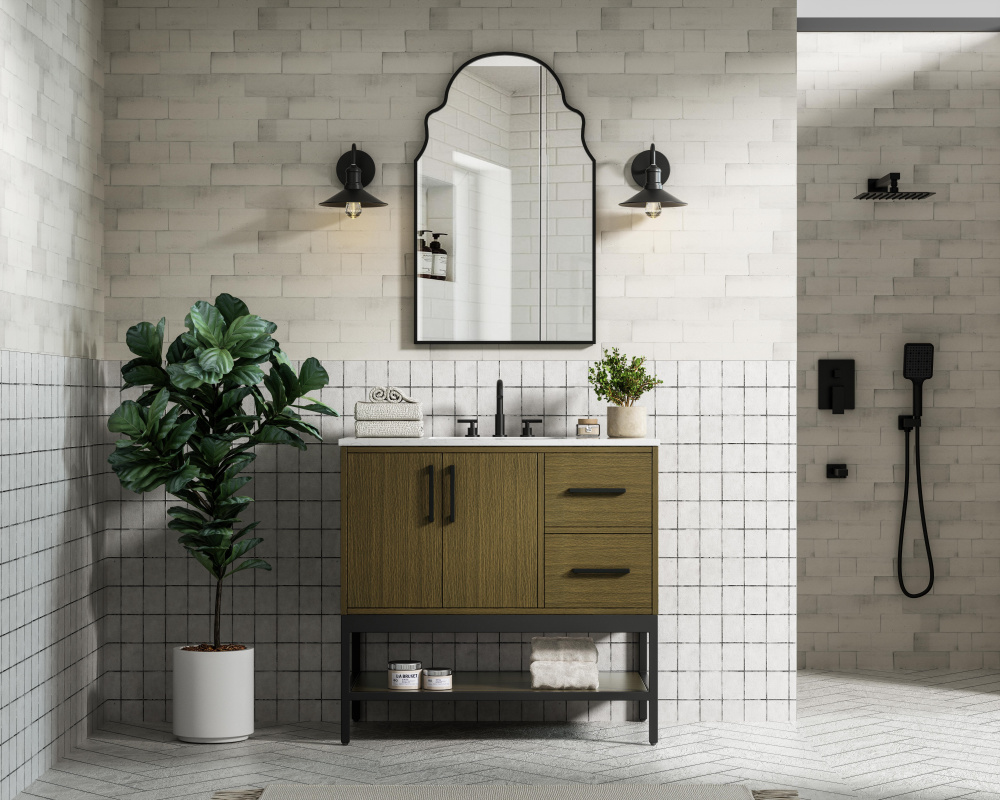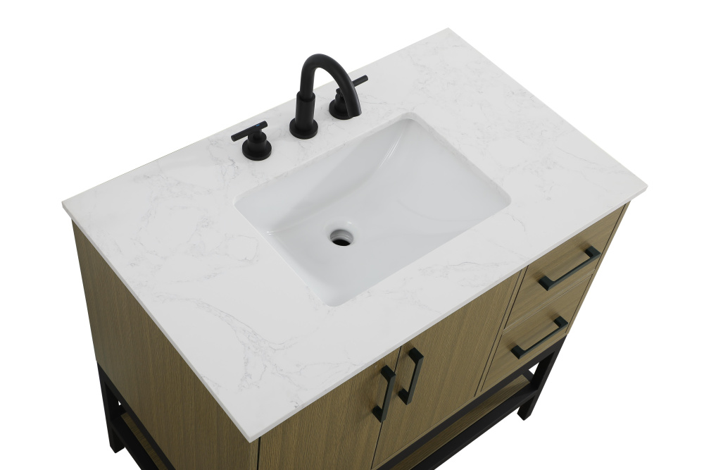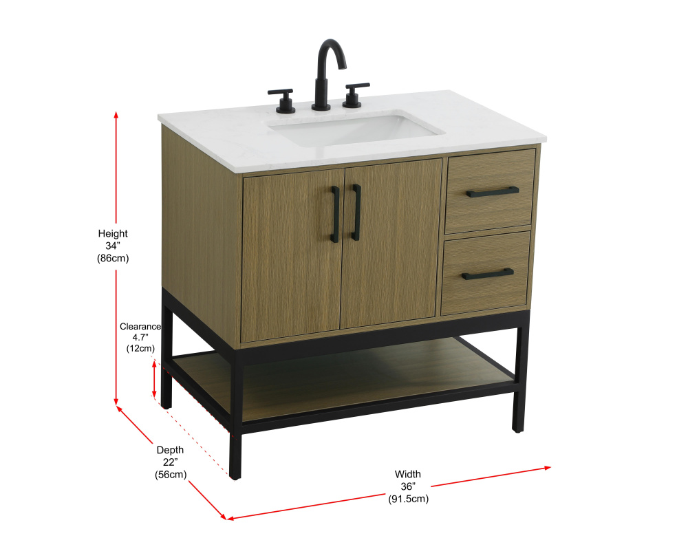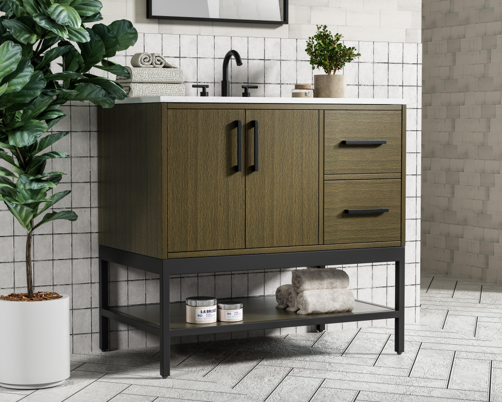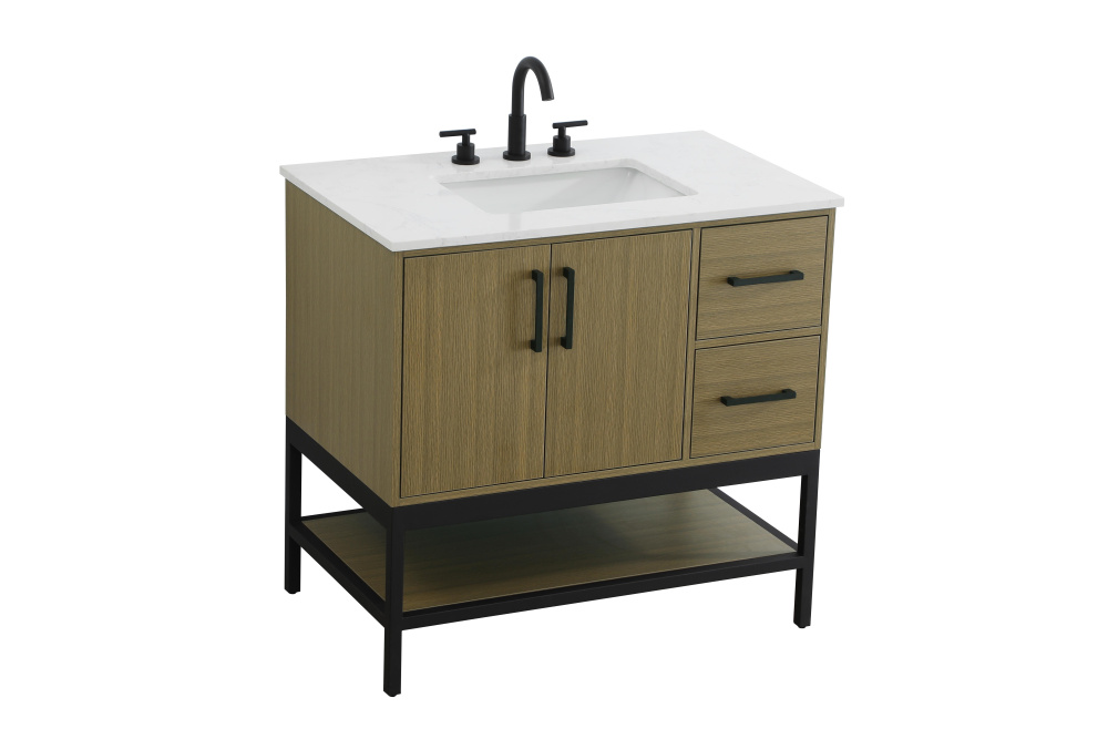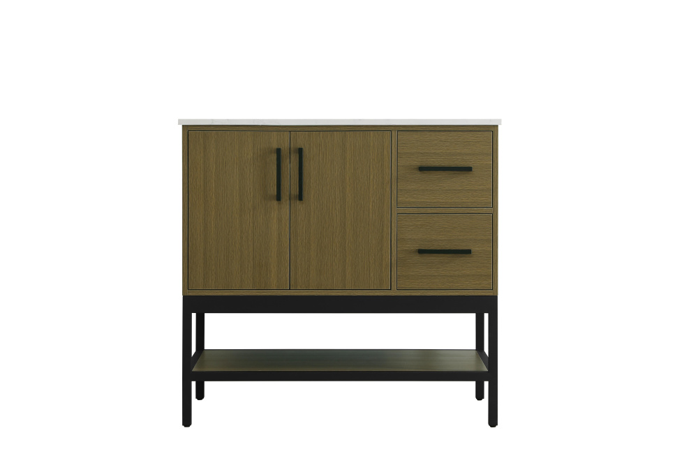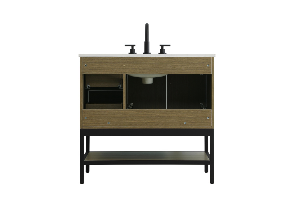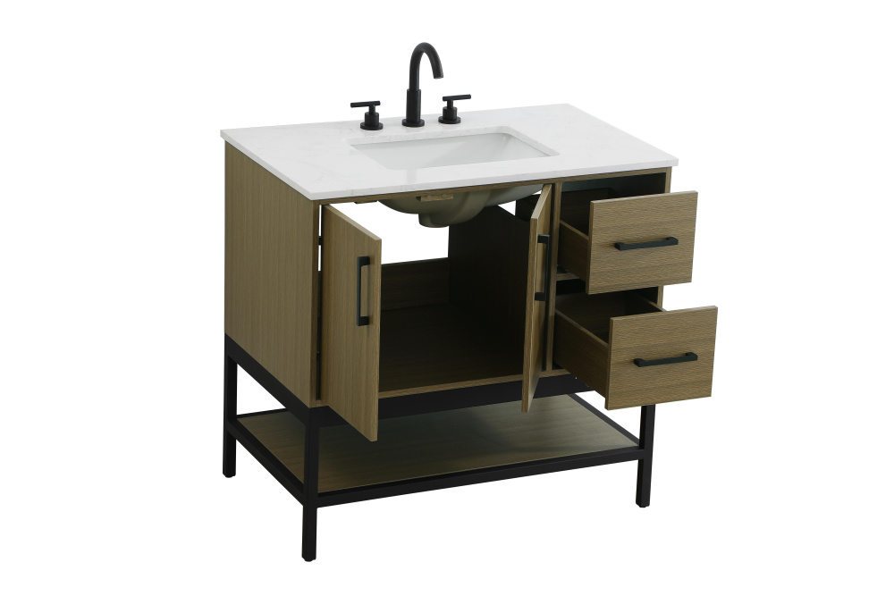 Upgrade your bathroom with this modern bathroom vanity that combines form and function effortlessly. Its sleek wood veneer cabinetry, paired with a bold black metal frame, brings a clean, contemporary vibe to any space. Designed with practicality in mind, this vanity offers soft-close drawers and cabinets to organize your essentials, as well as an open lower shelf for added storage or display. The durable white quartz countertop is built to withstand daily use, while the undermount ceramic sink ensures easy maintenance. Complete with matte black hardware and pre-drilled features for effortless installation, this vanity is the perfect centerpiece to refresh your bathroom with style and efficiency.