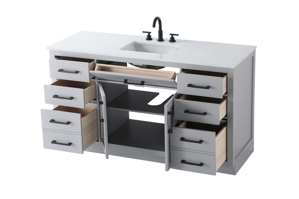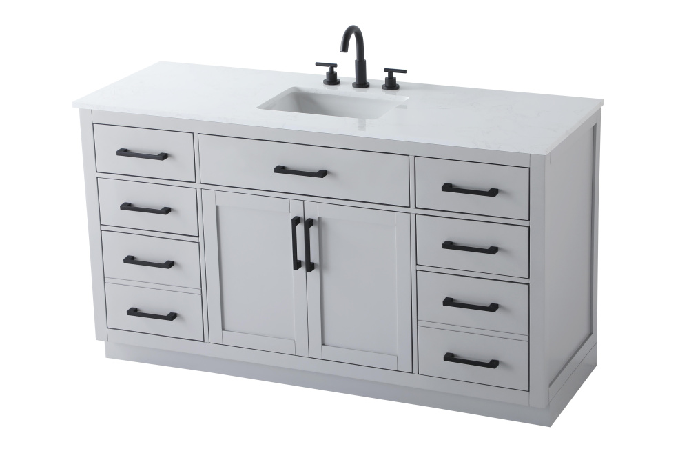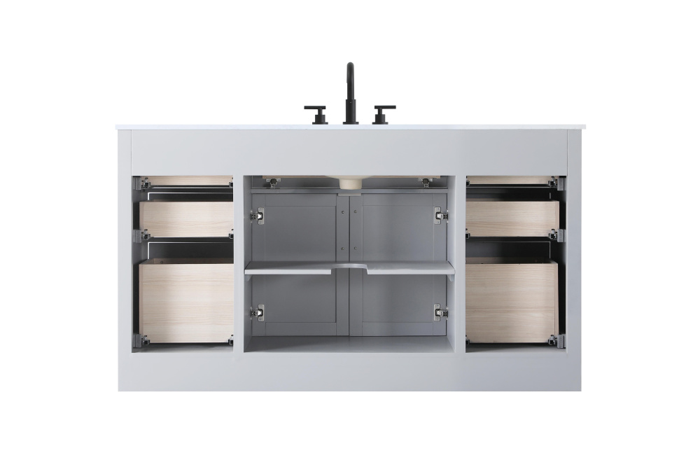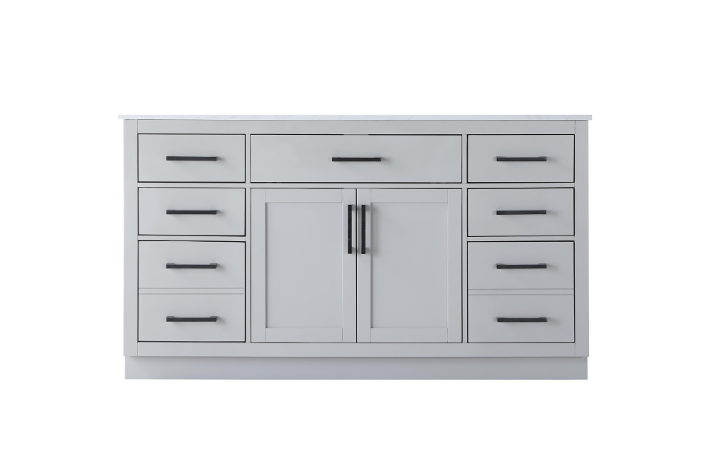 Introduce a perfect balance of functionality and style to your bathroom with this thoughtfully designed vanity. Constructed with a combination of solid wood and MDF, it offers durability and a sturdy build. The sleek engineered marble countertop with subtle grey marbling complements the rustic wood grain finish, creating a stylish and inviting centerpiece for your bathroom. Designed in a contemporary style with a transitional flair, it features a U-shaped shelf for seamless plumbing integration and multiple soft-close drawers for clutter-free organization. A pull-down drawer enhances convenience, while the toe kick adds a refined, clean-lined appearance and simplifies cleaning underneath. Matte black hardware contrasts beautifully with the cabinet finish, tying the look together. Delivered fully assembled and equipped with foot levelers, this vanity combines practicality and aesthetic appeal to suit modern and transitional bathrooms alike.