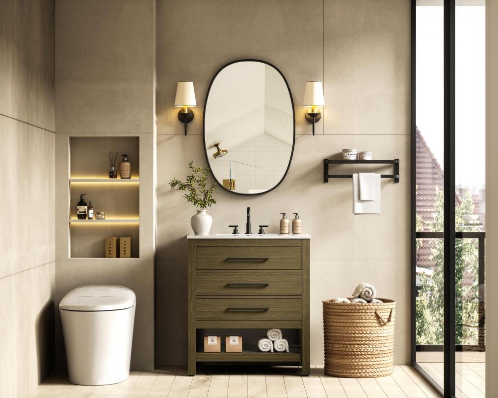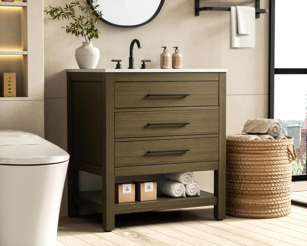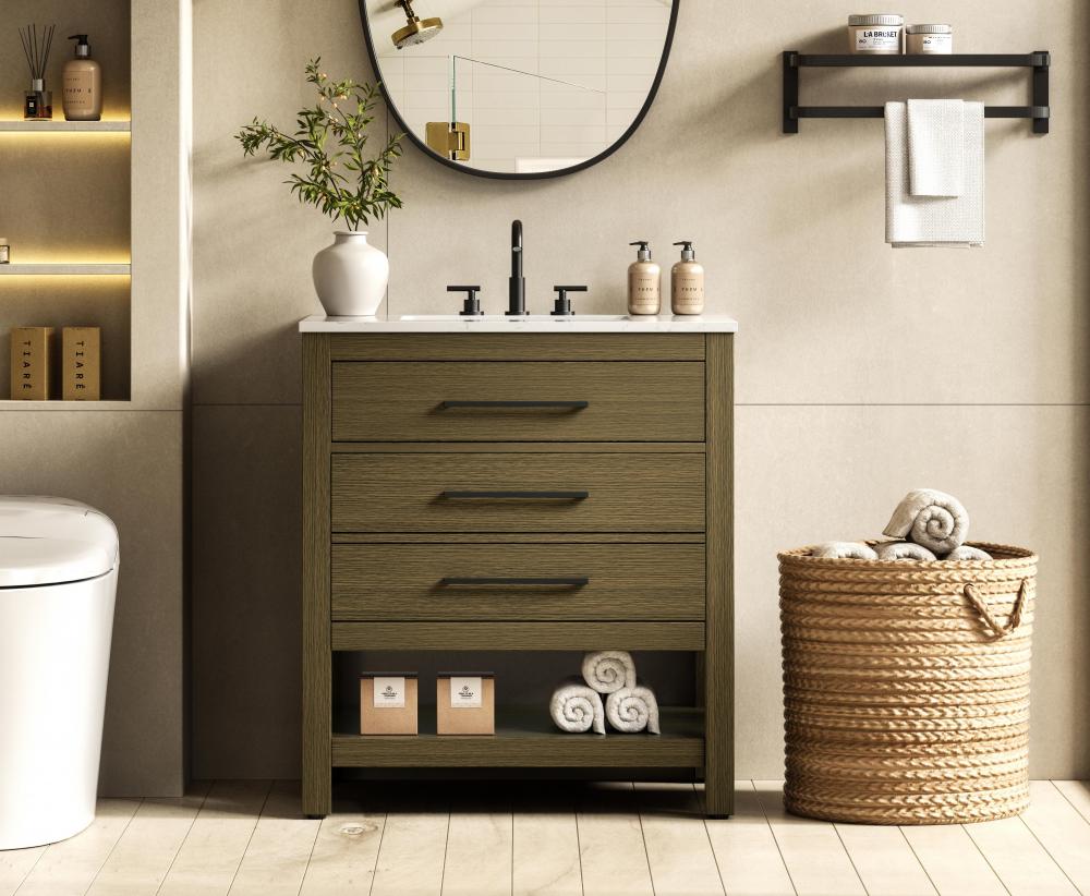 A functional tip-out drawer provides quick access to small items like toiletries, keeping your countertop clutter-free.