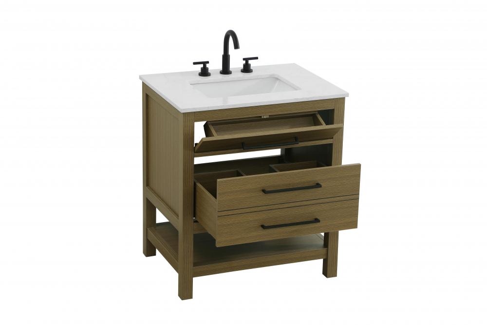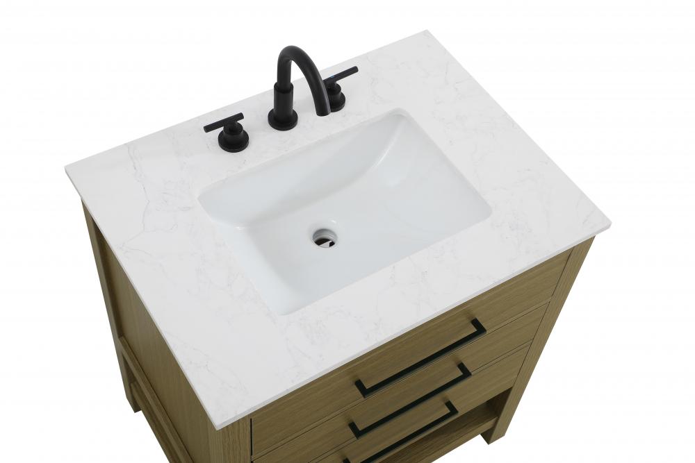 Elevate your bathroom design with this versatile and beautifully crafted bathroom vanity cabinet. The engineered marble top features striking veining, adding a luxurious focal point to your space. Built from premium solid wood and MDF, it ensures long-lasting durability and strength. The porcelain sink, complete with a concealed overflow, offers a seamless and refined finish.Available in four stunning finishes—Chestnut Brown, Honey Brown, Mocha Brown, and White—this vanity suits any interior style. Designed with convenience in mind, it features soft-closing drawers with modern handles and a tip-out drawer for easy access to small essentials, keeping your space tidy. The bottom deep drawer mimics the appearance of two separate drawers, providing ample storage for larger items, while the open shelf at the base offers additional storage space for towels or decor.Fully assembled for your convenience, it includes foot levelers for stability on any surface. For a complete look, pair it with an optional matching backsplash, sold separately. UPC certified for quality assurance, this vanity is the perfect combination of functionality, style, and ease of use.