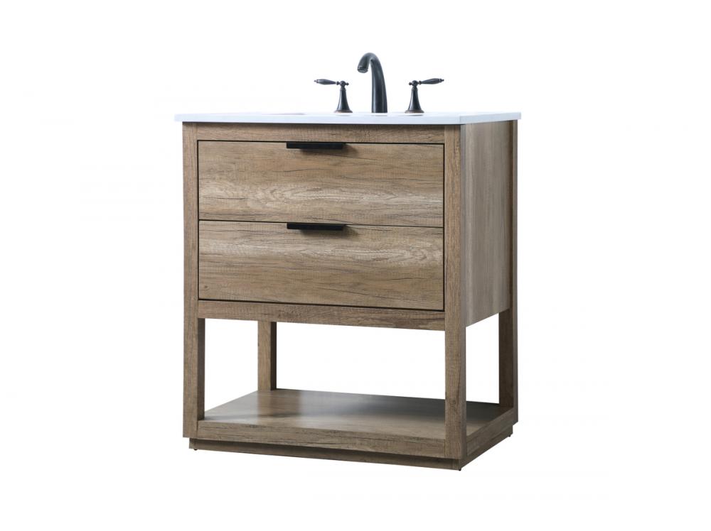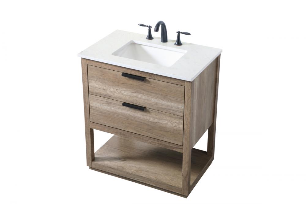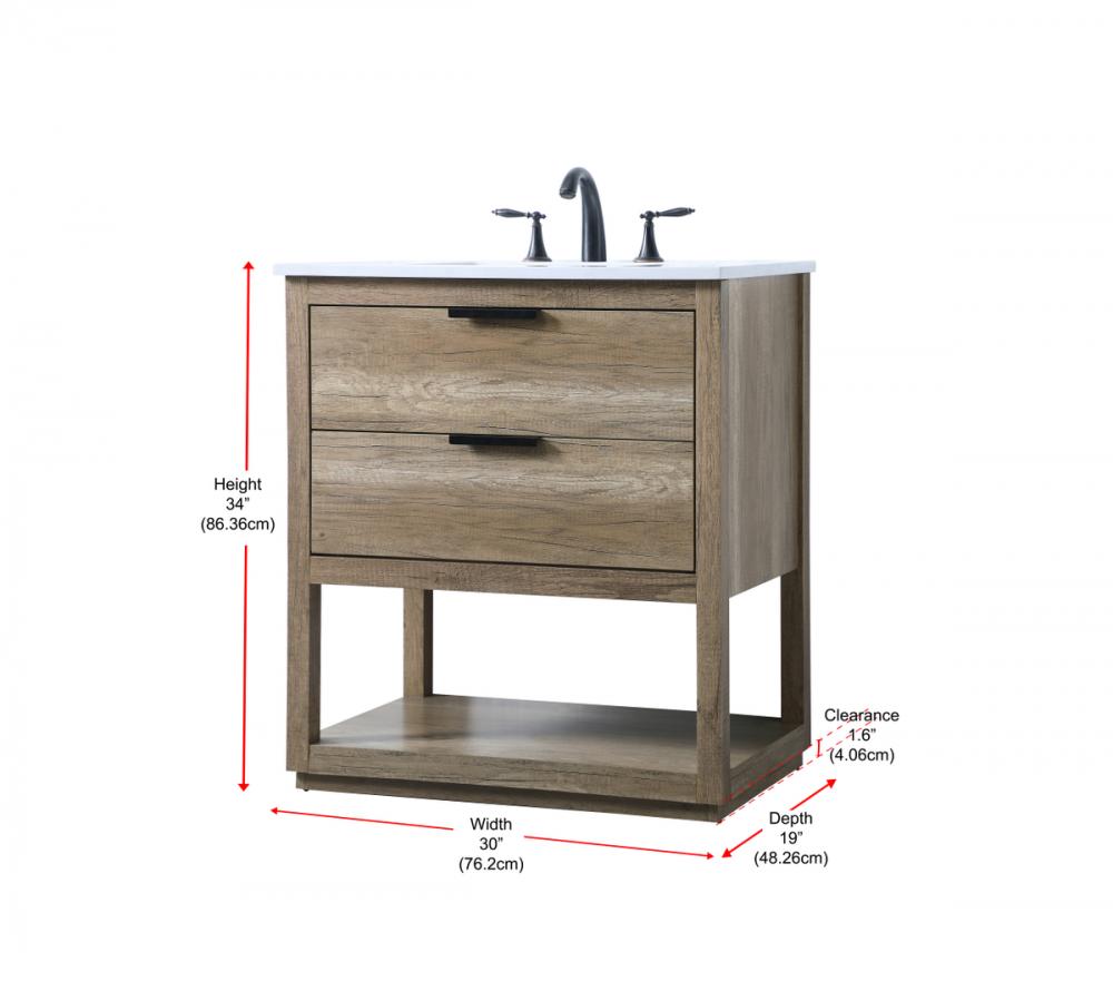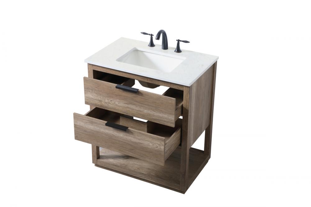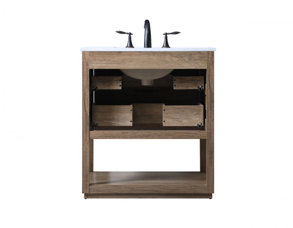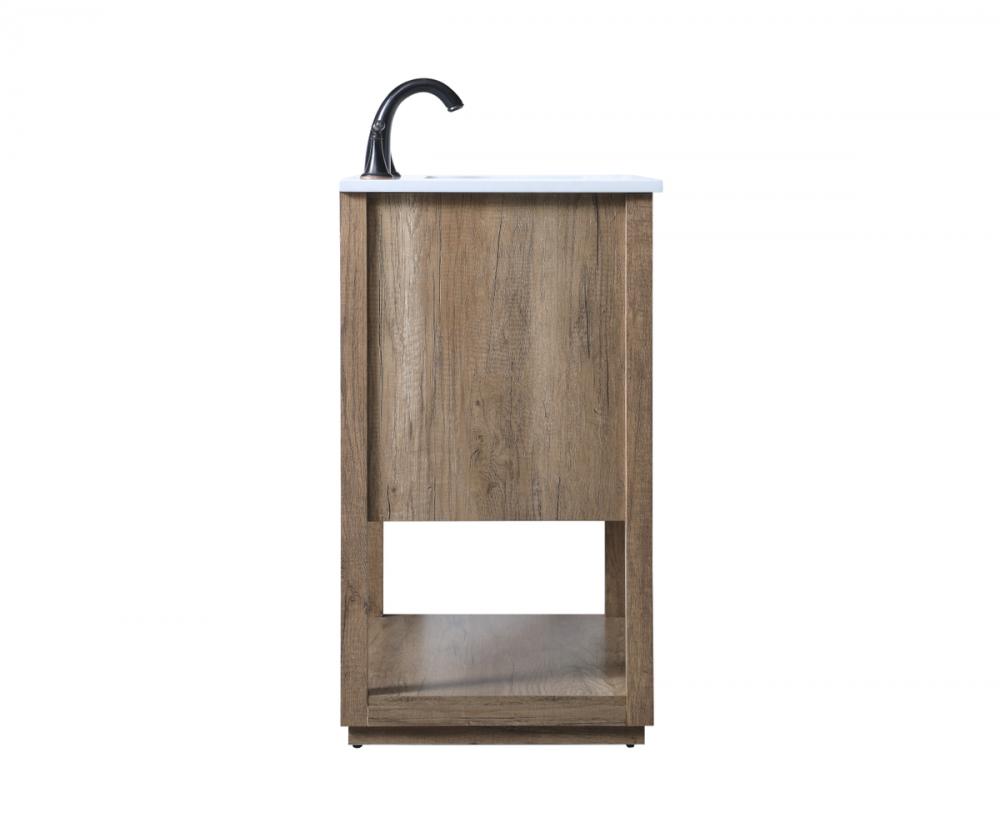 Featuring an open shelf at the bottom for extra storage, the vanity provides a convenient space to showcase decor or store essentials, adding functionality and style to your bathroom.