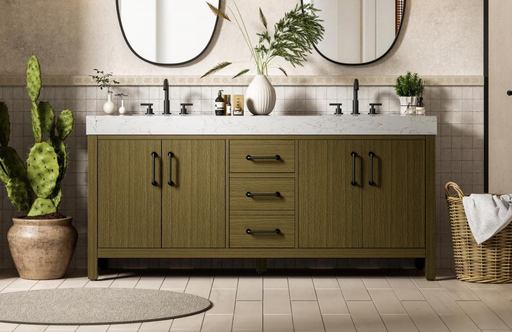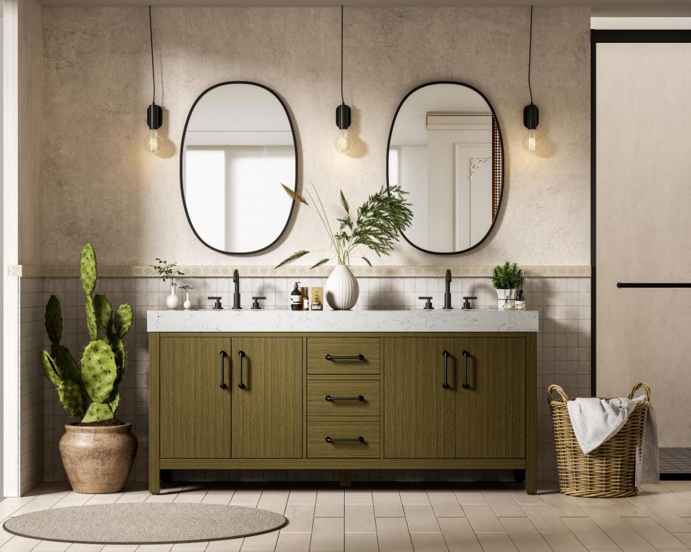 The door pulls are sleek, cylindrical handles in a matte black finish, providing a striking contrast to the warm wood tones of the vanity.