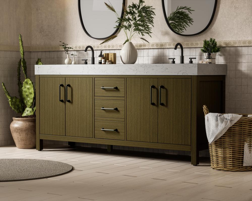 This bathroom vanity embodies a clean, minimalist design, perfectly suited for modern and transitional spaces. Its straight, sleek lines and flat-paneled doors create a refined yet approachable look. The warm, honey-toned finish highlights the subtle wood grain, adding visual interest while maintaining a sense of balance and simplicity. The design features a double-sink layout, emphasizing functionality and spaciousness, ideal for shared bathrooms. The central drawers and symmetrical cabinet doors create a sense of balance and structure. Matte black hardware offers a bold contrast to the warm wood tone, reinforcing the modern aesthetic while maintaining a timeless appeal. The thick engineered marble countertop adds a sturdy, minimalist element, with its clean white surface further elevating the overall sophistication of the vanity. This piece is a perfect marriage of style and practicality, effortlessly complementing both modern and transitional bathroom designs. This vanity is delivered fully assembled and equipped with foot levelers for effortless installation and stability. Combining practicality and bold design, this vanity is UPC certified and ready to transform your bathroom space.