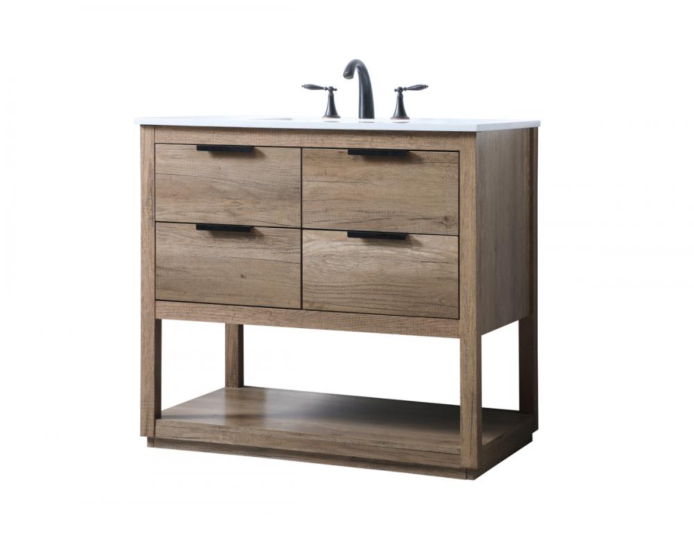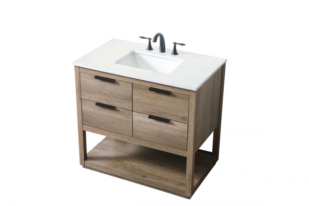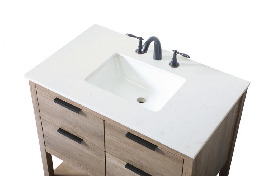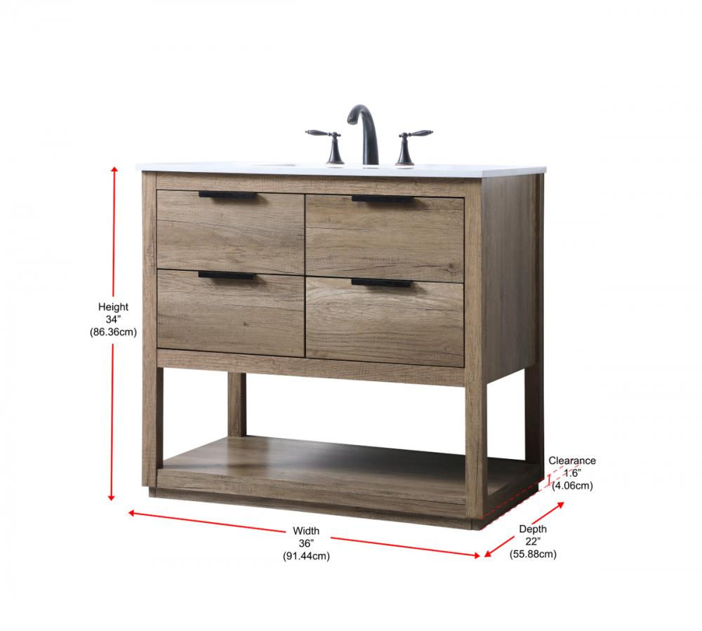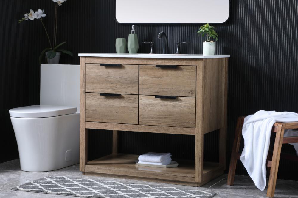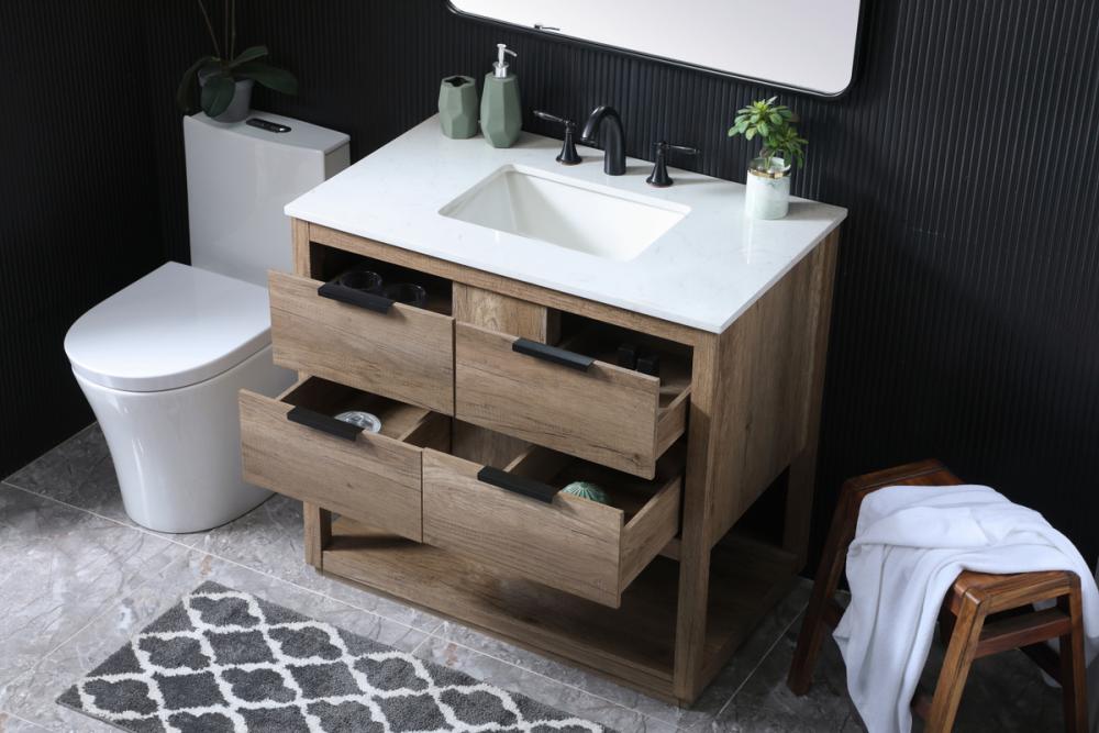 Featuring an open shelf at the bottom for extra storage, the vanity provides a convenient space to showcase decor or store essentials, adding functionality and style to your bathroom.