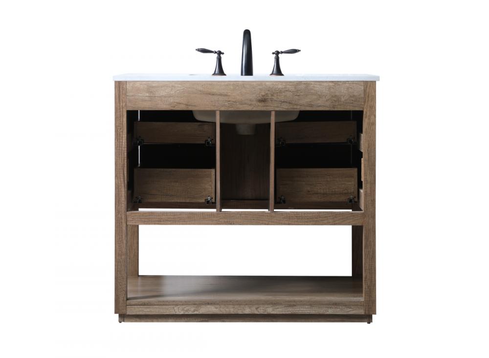 Elevate your bathroom effortlessly with our stylish vanity. Featuring an engineered marble top and chic straight edge cut, it brings a touch of modern elegance. The four soft-close drawers are adorned with sleek pulls, which offer both convenient storage and a contemporary aesthetic. Completing the ensemble, an undermount porcelain sink adds timeless charm. The vanity's open shelf at the bottom provides extra storage and a space to showcase decor. As a freestanding unit, this hassle-free solution requires no assembly. Customize your space effortlessly with this sophisticated option for instant bathroom elegance.