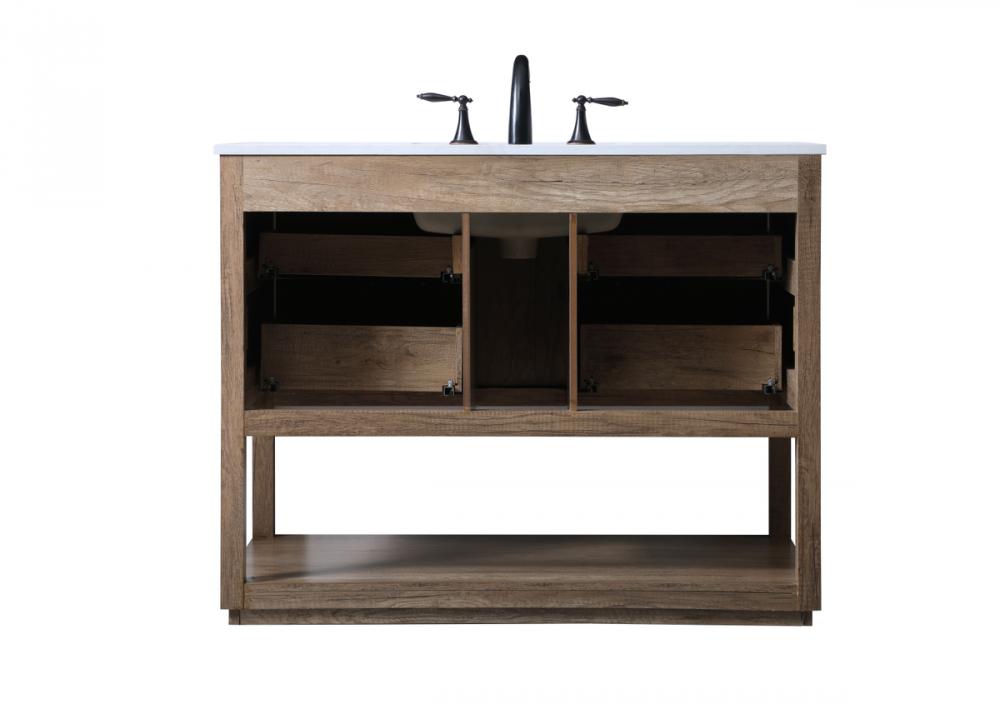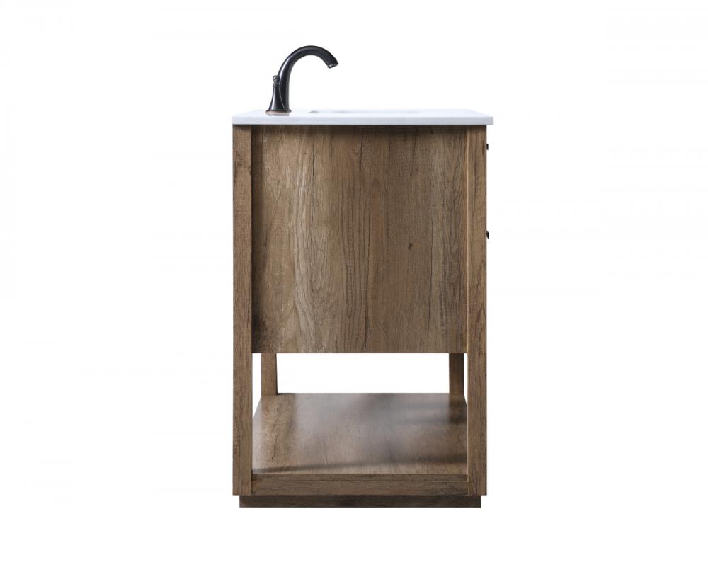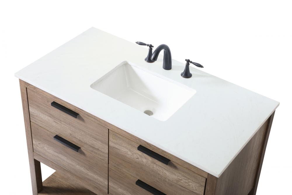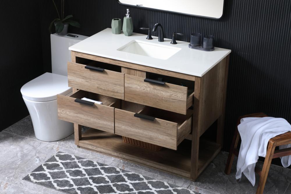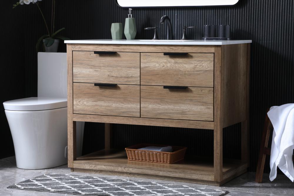 Featuring an open shelf at the bottom for extra storage, the vanity provides a convenient space to showcase decor or store essentials, adding functionality and style to your bathroom.