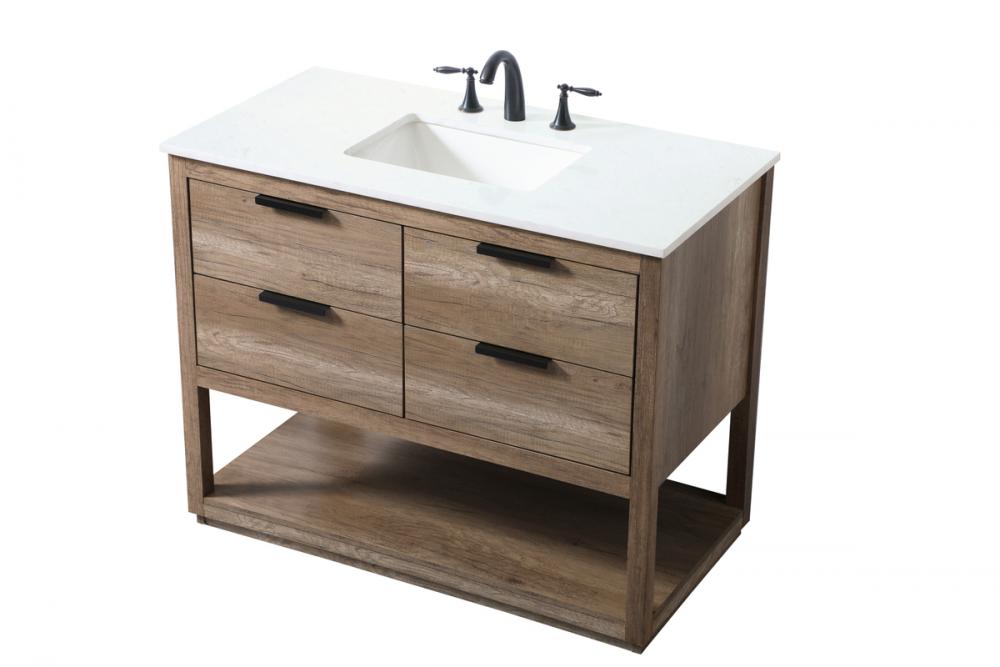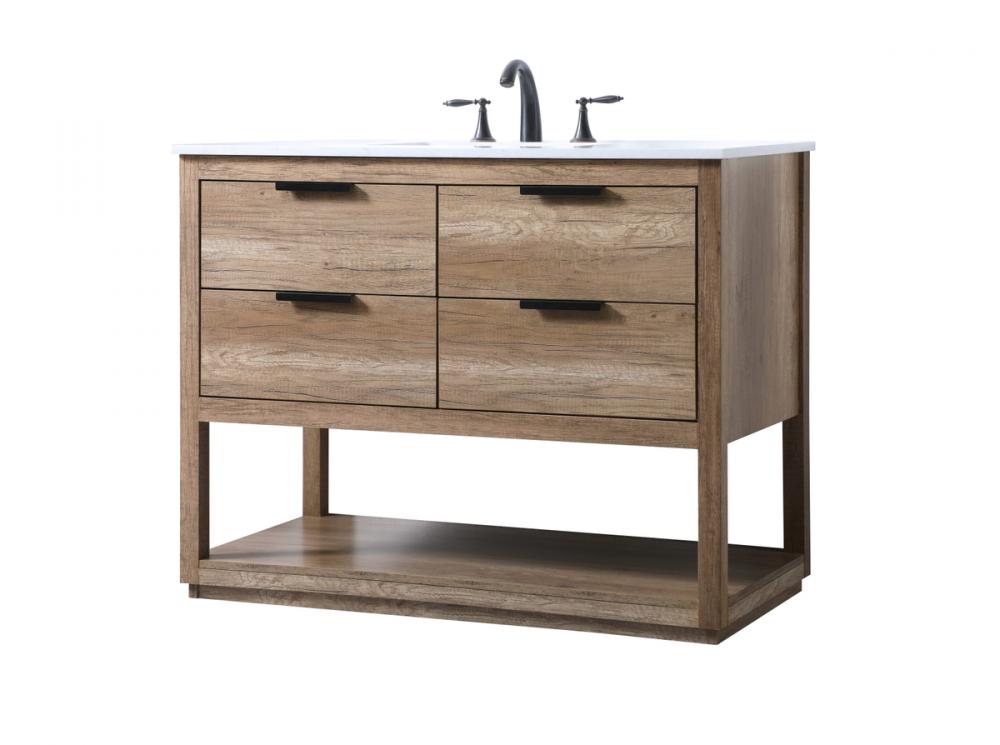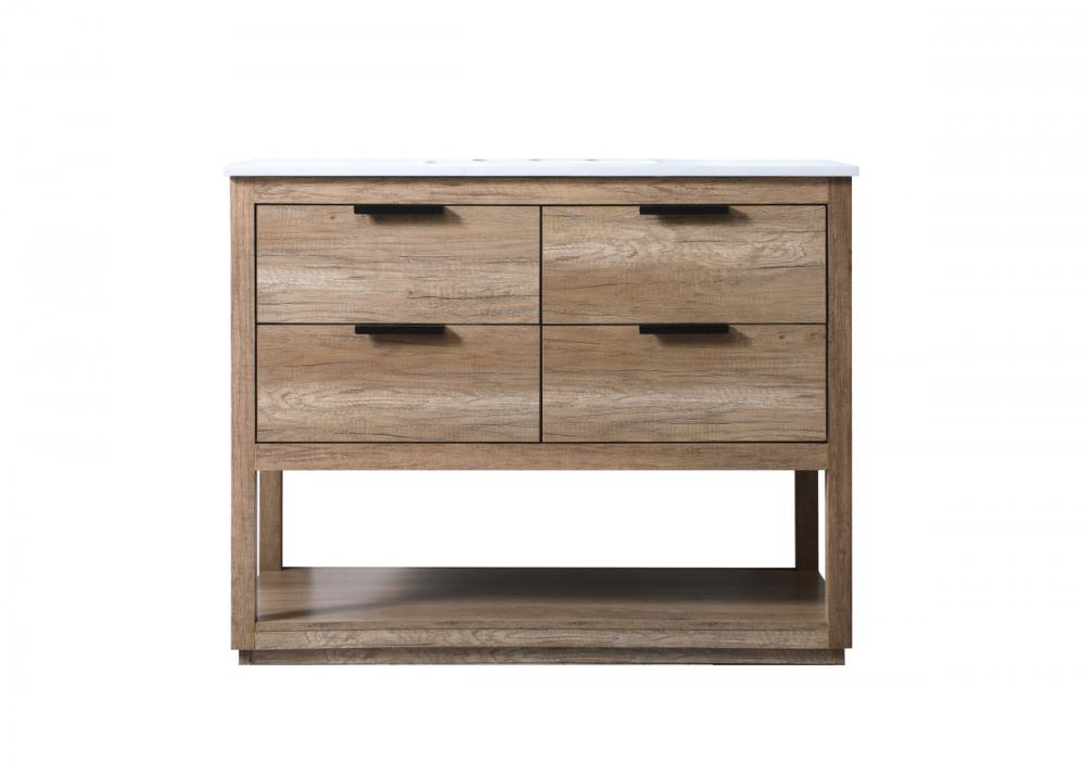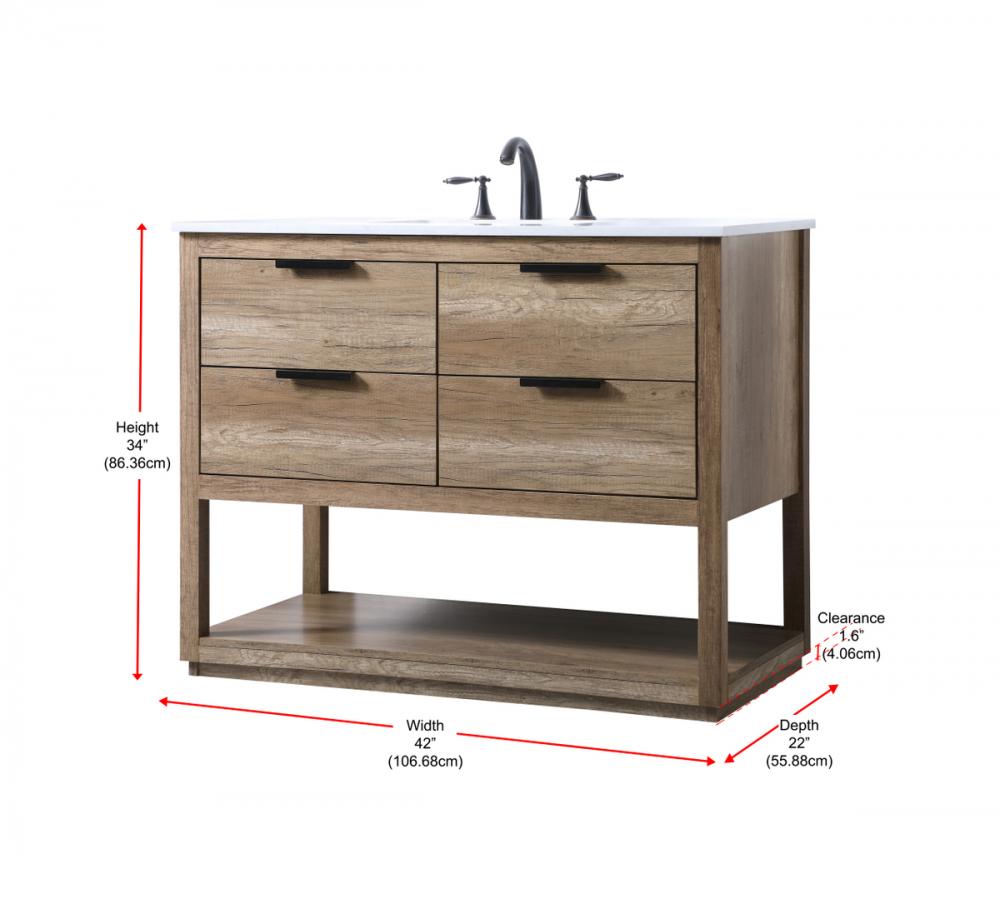 Featuring an open shelf at the bottom for extra storage, the vanity provides a convenient space to showcase decor or store essentials, adding functionality and style to your bathroom.