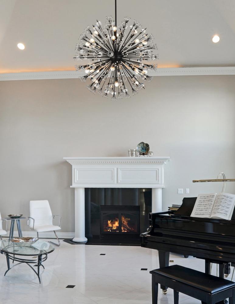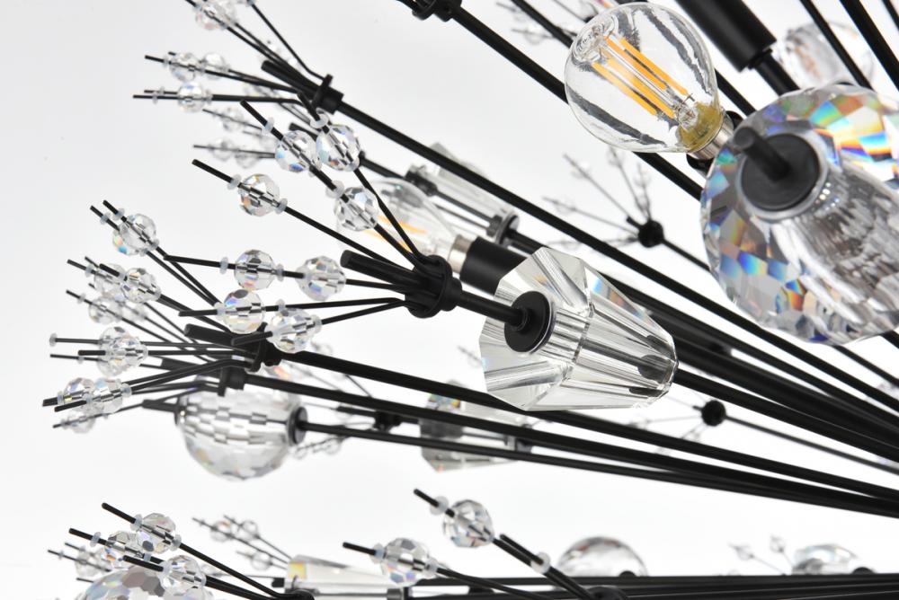 Like an explosion frozen in time, Vera collection hanging fixtures are suspended chaos. Clear large crystal balls and sprays of smaller crystals swirl amidst exposed candelabra bulbs (not included) balanced on dainty wires. A gleaming steel sphere forms the epicenter of the storm. A touch of savage beauty that easily compliments a kitchen, entryway, or bedroom. Sloped ceiling adaptable with a durable swivel could be mounted on vaulted or angled ceilings