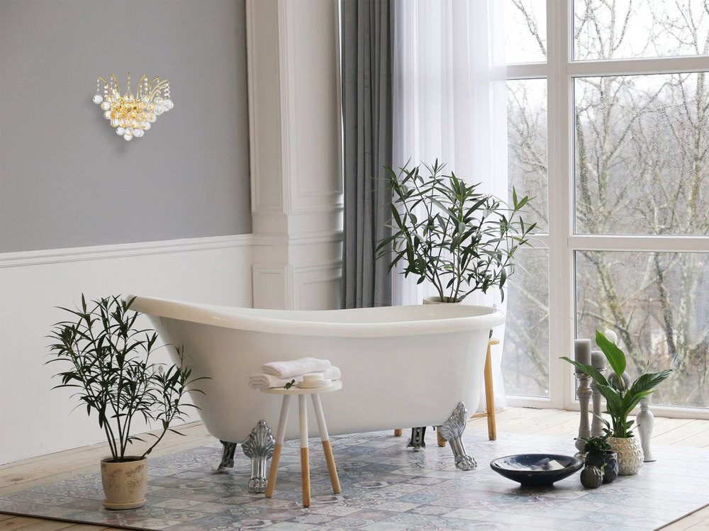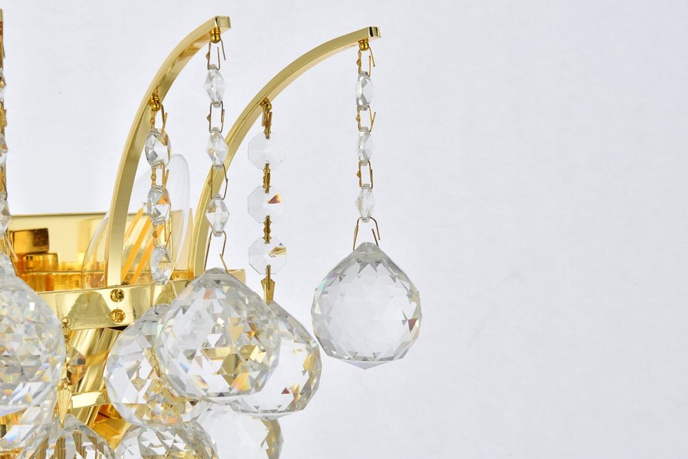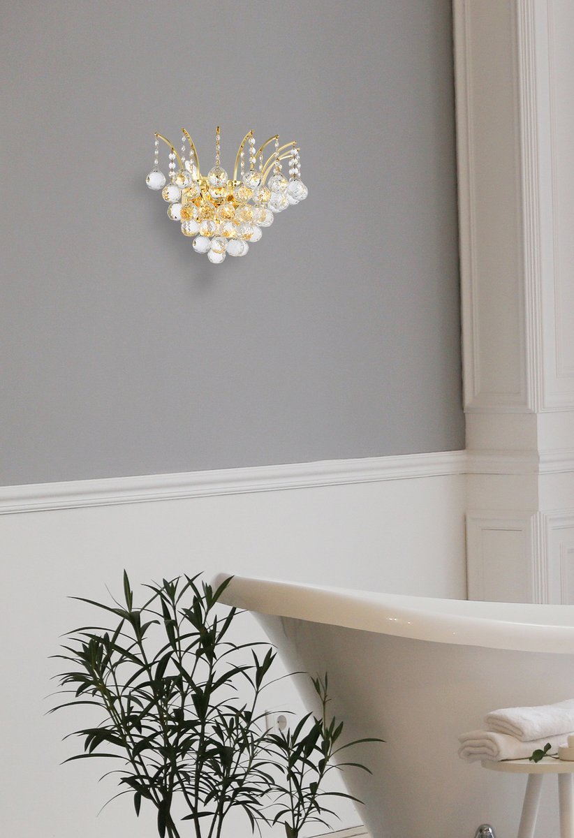 Straight from New York during the Roaring ‘20s, Victoria collection wall sconces are brimming with style and sophistication. The classical design flaunts a pointed center completely covered in gleaming rows of clear crystal balls. Delicate arms dangle crystal octagon strands and matching crystal balls along the top edge of the frame to add harmony and cohesion. Available in a chrome or gold finish, Victoria wall sconces are certain to wow your guests in a hallway, bathroom, or entryway.