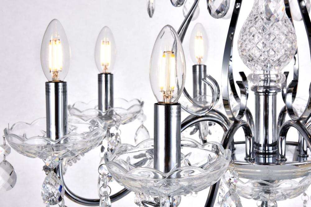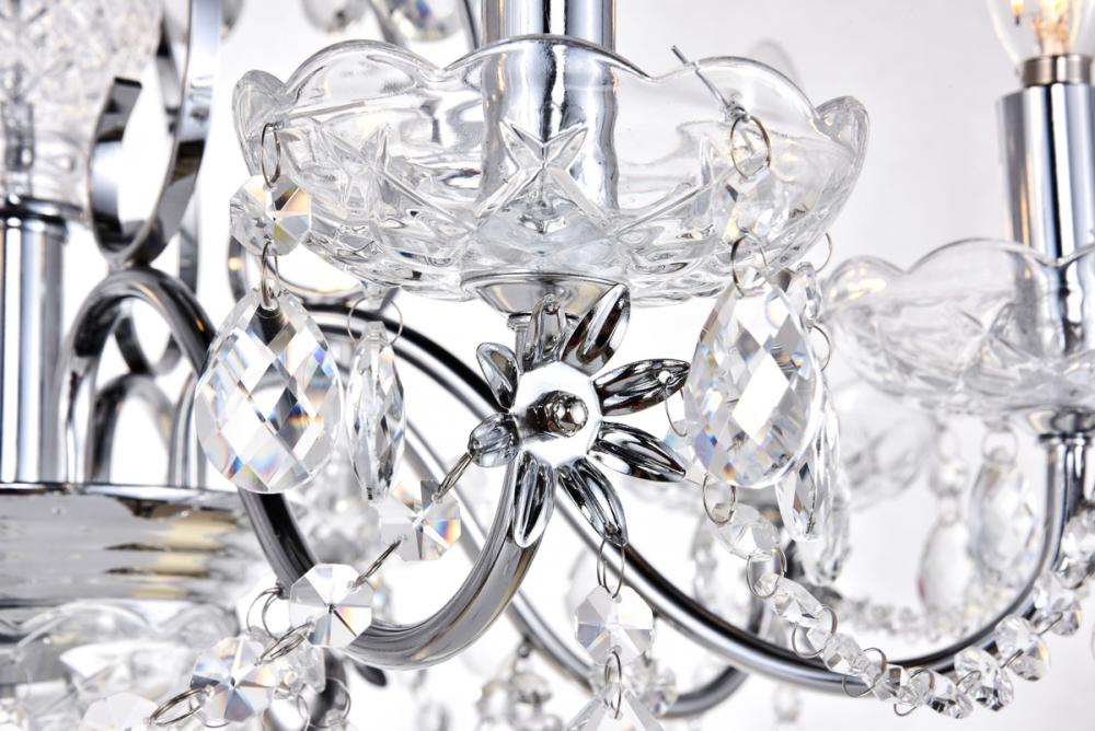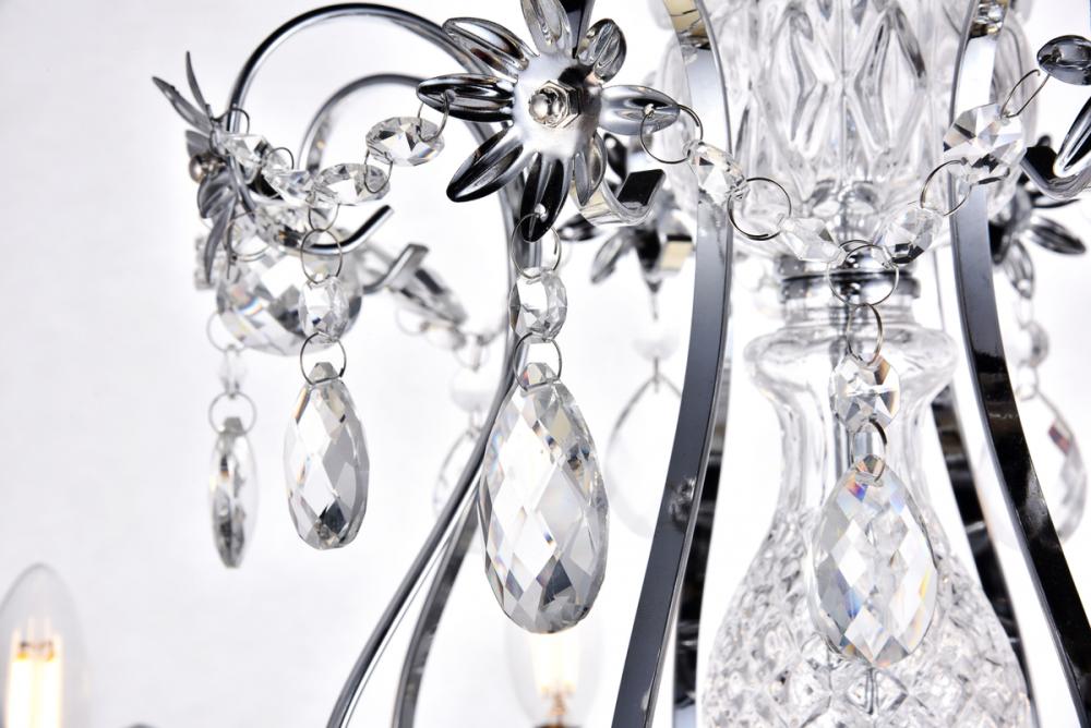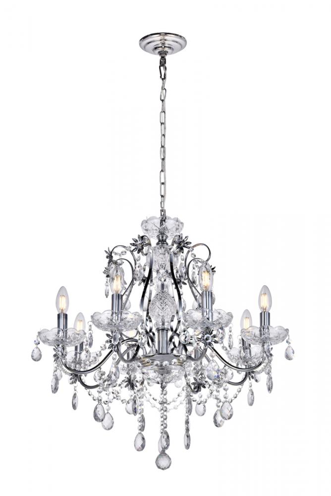 Glamour has never been this enlightening. Voltaire collection hanging fixtures are reinventing the classical chandelier. The graceful frame in a gleaming Chrome finish forms swirling arms that are underscored by dangling festoons of clear Crystal octagon strands and sparkling clear royal-cut Crystal teardrop pendants. An ornate pressed-Glass center column with corresponding bobèches contrast with the tapered Metal flower-shaped accents. With two alternate size options, these chandeliers are ideal for a dining room, stairwell, living room, or bedroom.