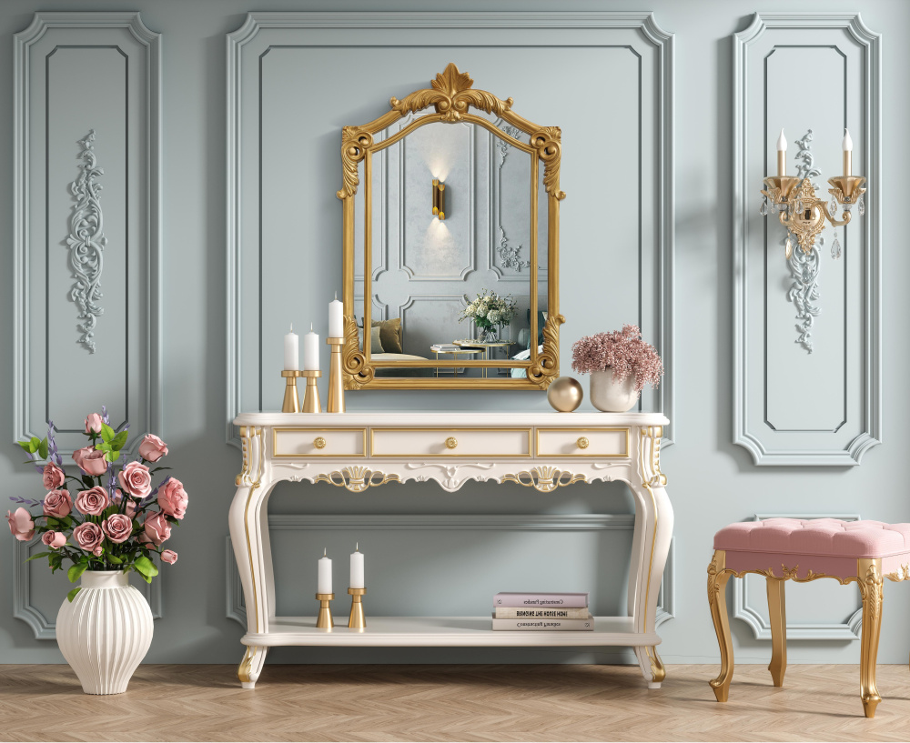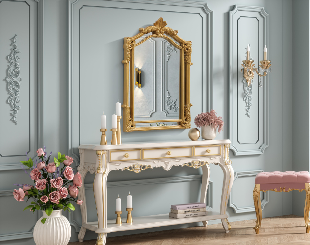 Whether placed in a living room, grand entryway, or above a vintage vanity, this mirror instantly enhances its surroundings with its regal presence.