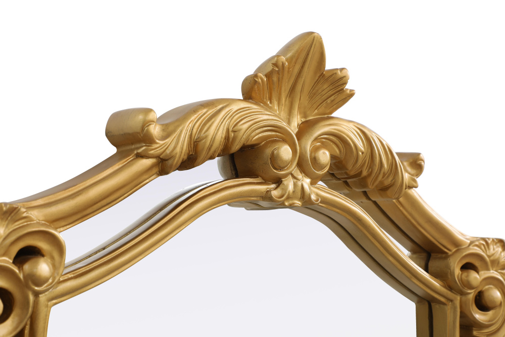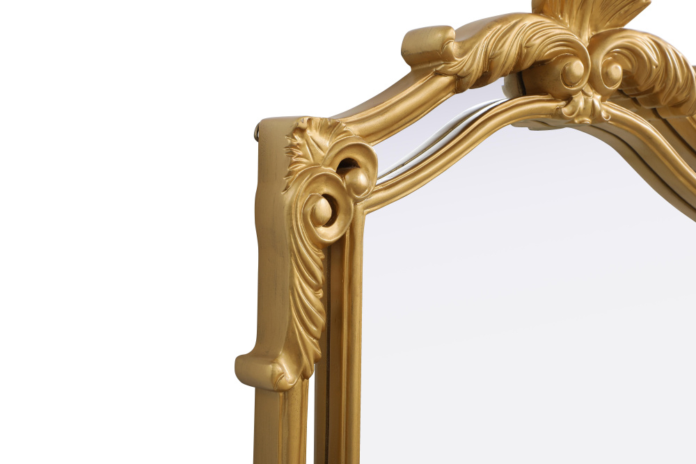With its ornate crest and intricate corner embellishments, this mirror transforms any space into a masterpiece of classic décor