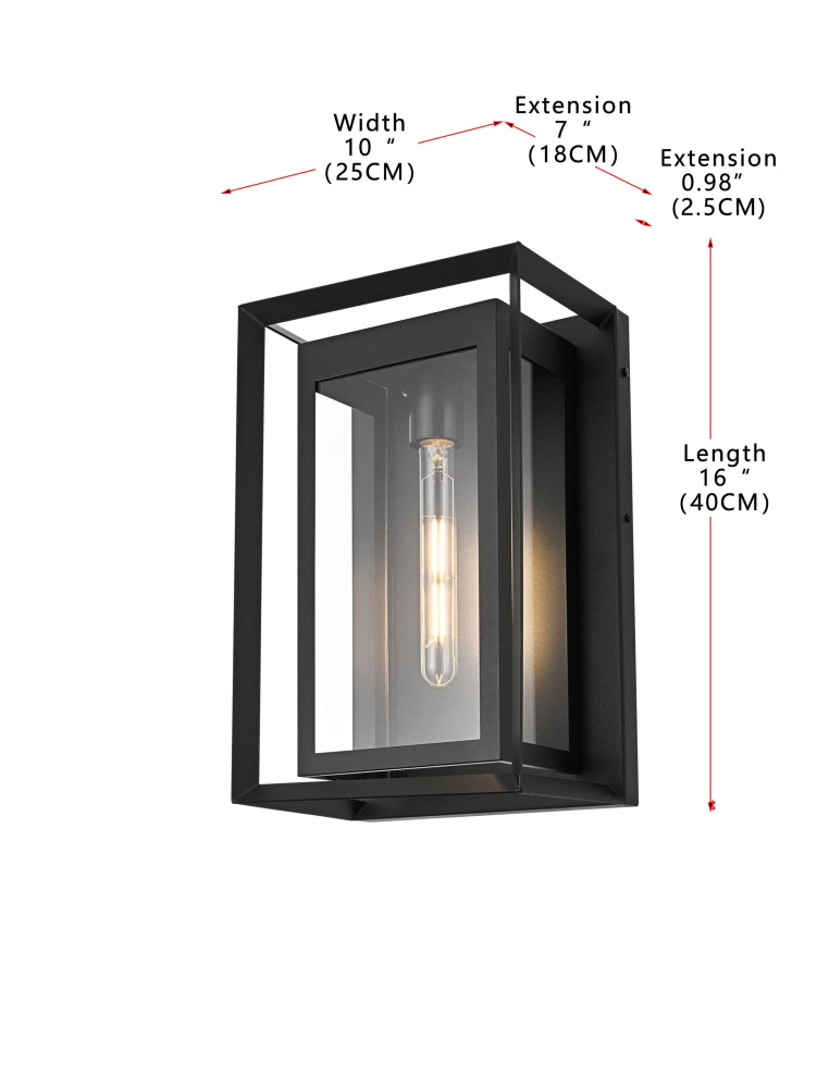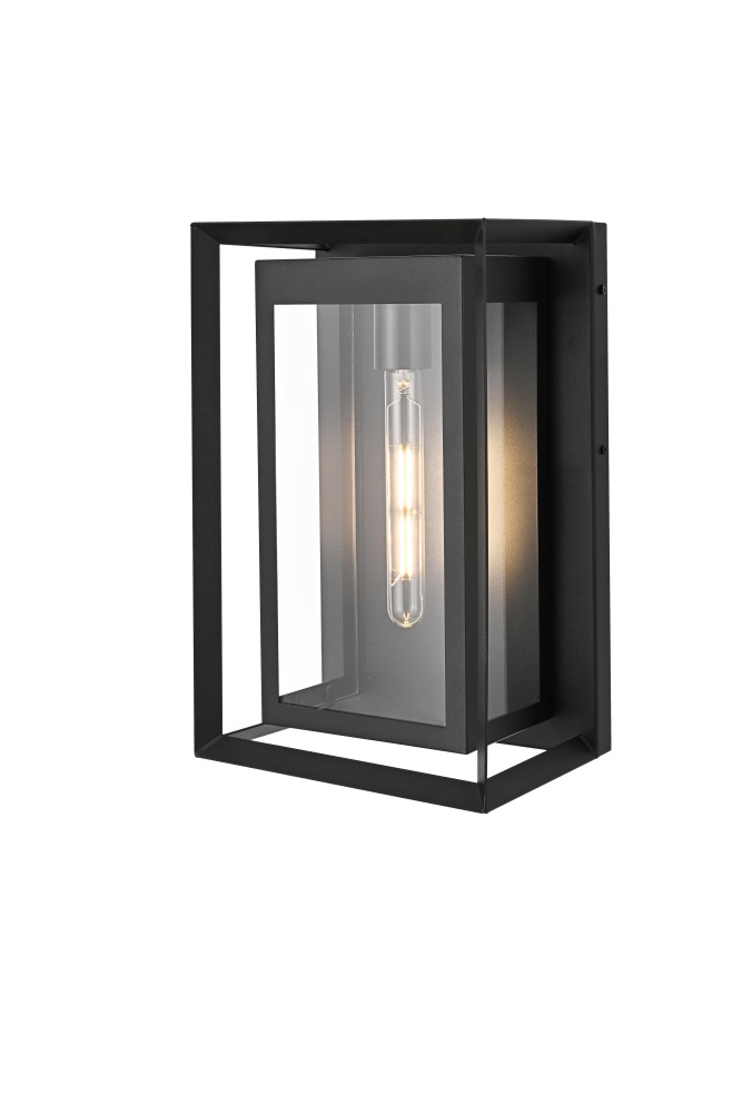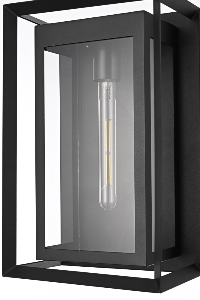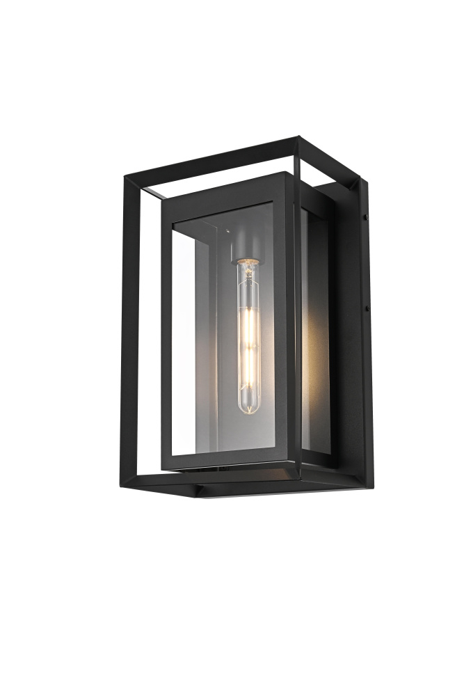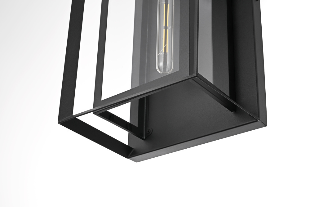 This striking outdoor wall sconce combines classic form with modern touches, crafted from sturdy iron and clear glass panels to create a sophisticated, timeless look for your outdoor space. The E26 socket offers a versatile bulb choice, while the geometric rectangular design draws attention to the beauty of its bold, open frame. The clean lines of the sleek iron structure perfectly frame the warm glow emanating from within, providing both aesthetic appeal and functional illumination. Whether flanking your front door, brightening your backyard patio, or lining your porch, this outdoor wall sconce will add style and a welcoming glow to any setting.