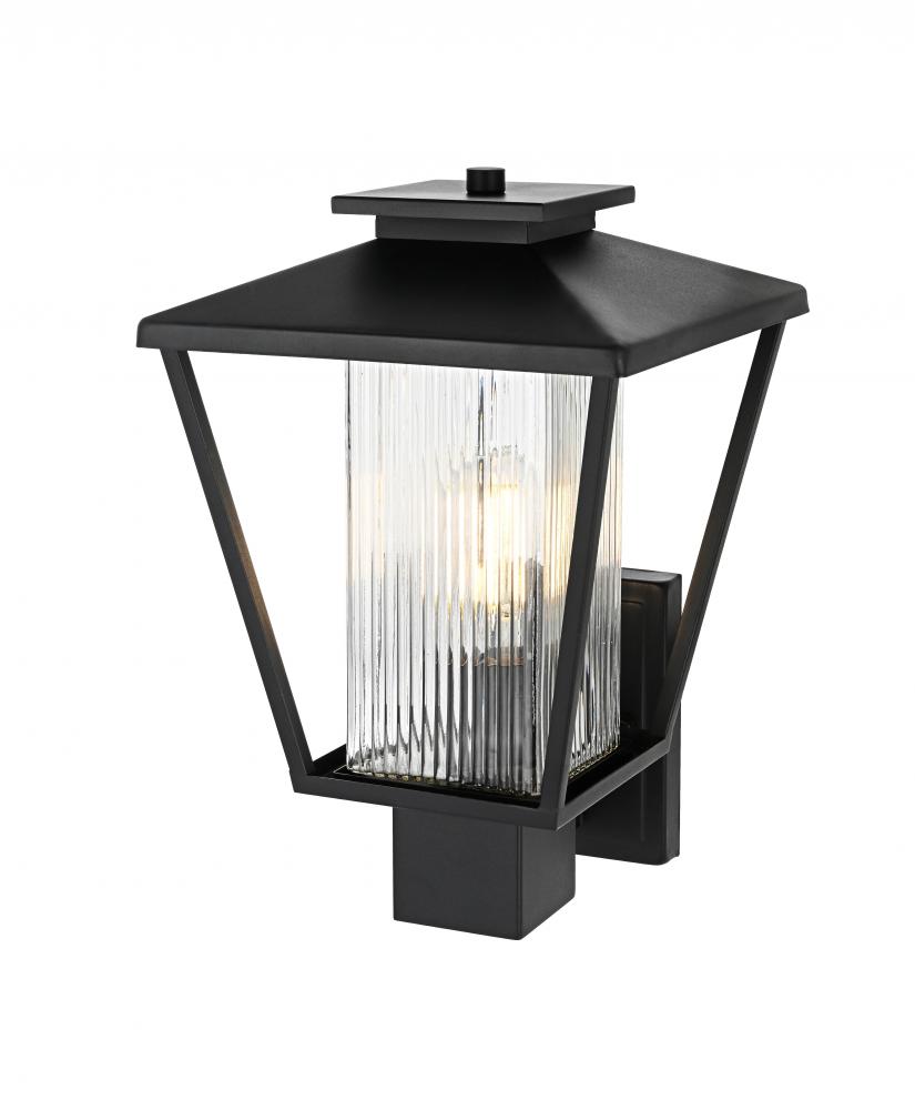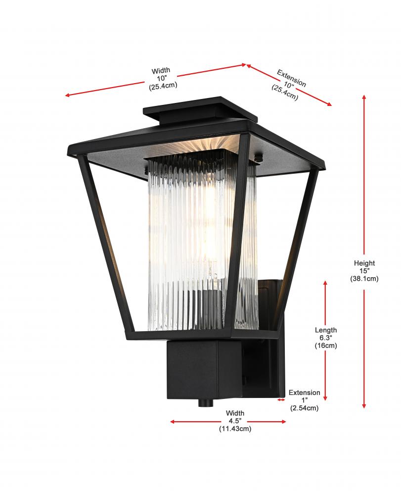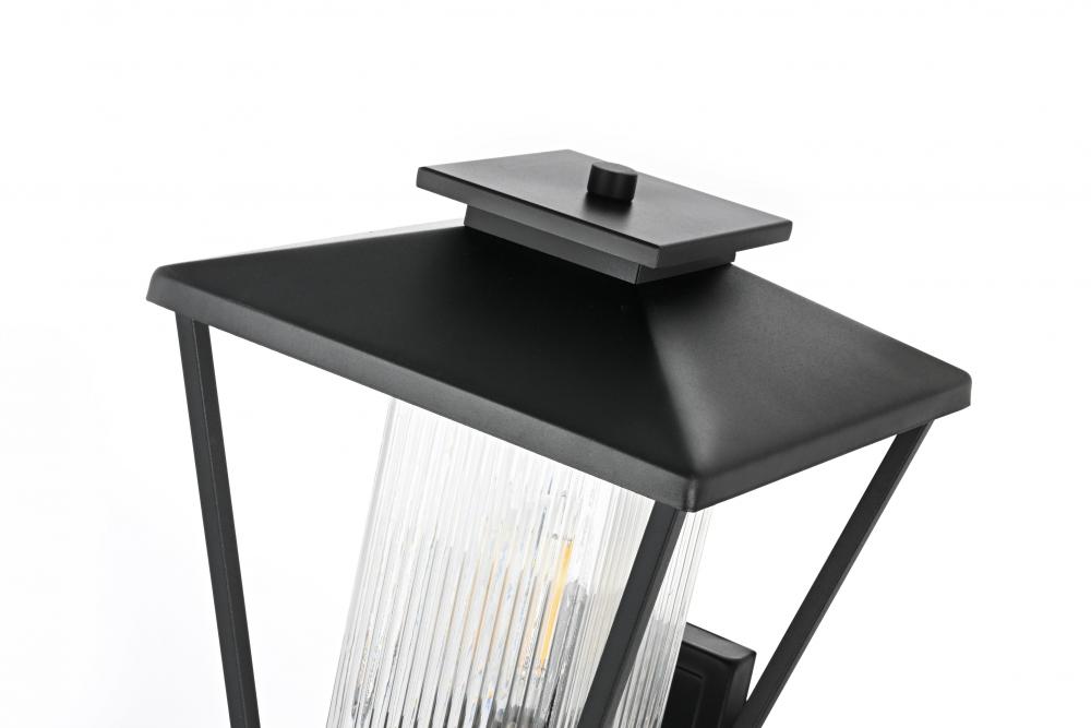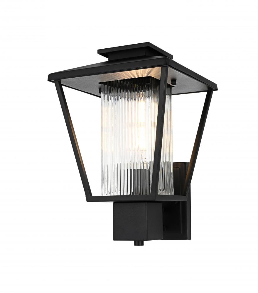 This striking outdoor wall sconce is perfect for adding style and illumination to your home’s exterior. with its iron frame and ribbed glass shade, this fixture combines durability with a touch of sophistication. The ribbed glass beautifully diffuses the light, creating an inviting atmosphere for your porch or patio. Designed with a versatile and timeless silhouette, it will complement various architectural styles. The subtle matte black finish enhances its modern appeal while maintaining a low-key yet powerful visual presence.