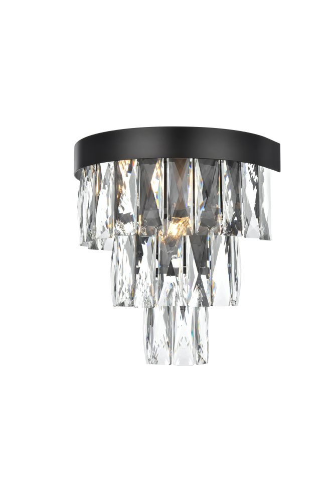 Transform your space with this extraordinary wall sconce that reimagines classical crystal design for contemporary interiors. The masterfully engineered silhouette features three graduating tiers that create a spectacular inverted pyramid, reminiscent of a frozen cascade captured in mid-descent. Each precisely cut rectangular crystal is strategically positioned to maximize light play, creating mesmerizing displays of fractured light throughout your space. The thoughtful construction incorporates 2 light sources distributed throughout the tiers, ensuring both spectacular illumination and enchanting crystal animation. The robust iron framework provides a secure foundation while maintaining visual lightness, allowing the crystals to appear as if floating in space. Available in reflective chrome, sophisticated black, or warm satin gold, this pendant makes an unforgettable statement while maintaining refined restraint. The cascading arrangement creates a sense of movement and flow, while the geometric precision of each crystal adds contemporary edge to the classical form. This is more than a light fixture – it's an architectural feature that transforms your space through its commanding presence and spectacular light performanc