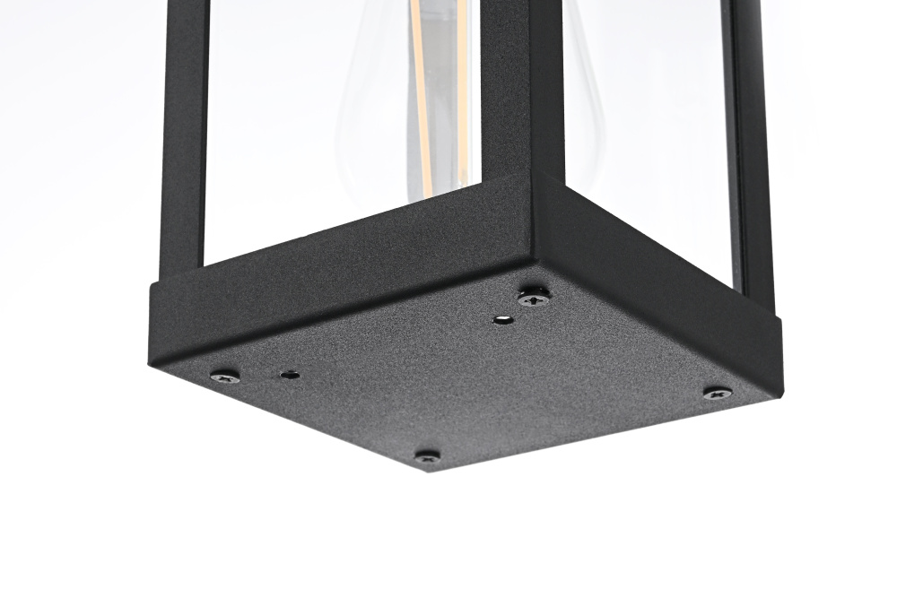Bring definition and clarity to outdoor spaces with a modern lantern that makes a statement. A crisp rectangular frame, crafted from durable iron with a matte black finish, offers a bold contrast to the clear glass panels that surround the bulb. The structured design features an enclosed bottom for a clean and finished look, while the suspended bulb effect creates a striking focal point. A minimalist backplate and streamlined mounting arm maintain the sleek aesthetic, making this wet-rated wall light perfect for patios, entryways, and garages. Designed with an E26 socket (bulb not included), this lantern provides customizable lighting to enhance any exterior with precision and style.