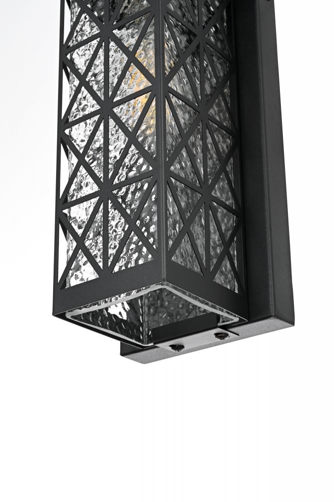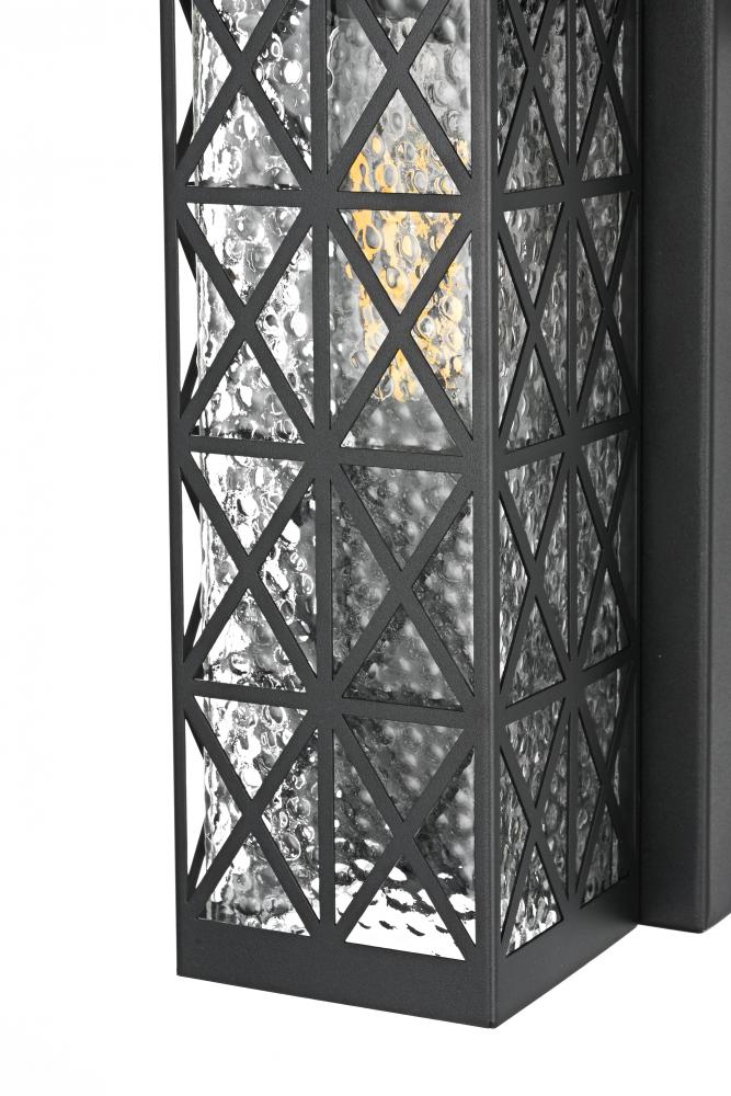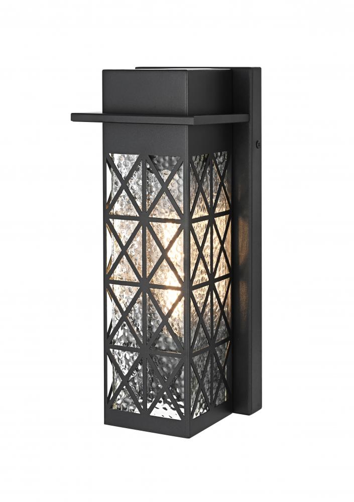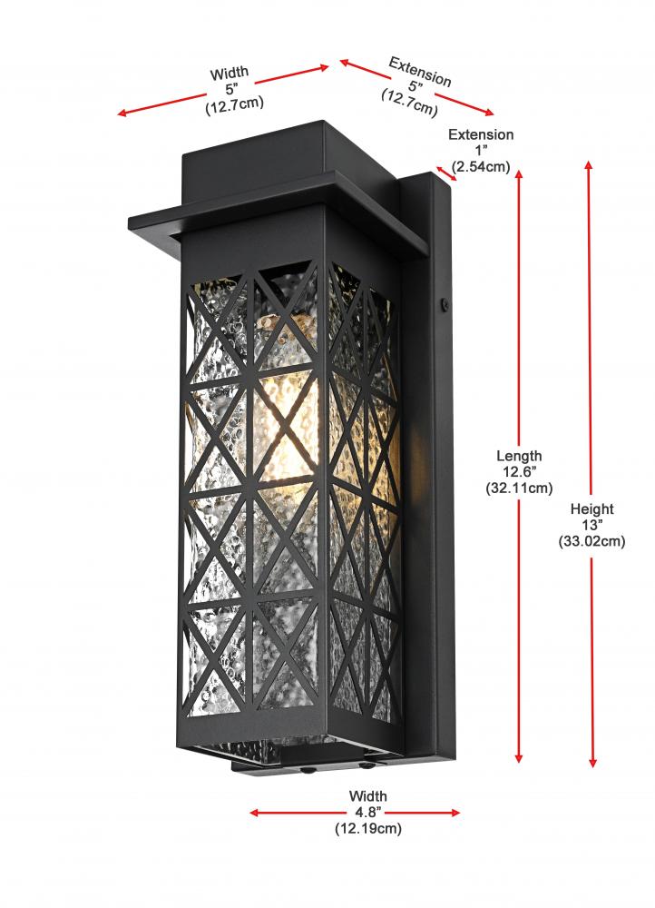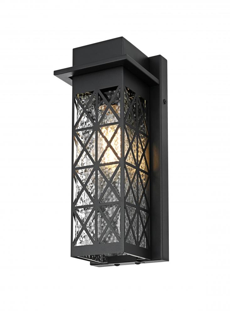 Enhance your home's exterior with this outdoor wall sconce, designed to bring both durability and visual appeal to your outdoor space. Crafted from high-quality iron, this light fixture features a striking criss-cross design that adds both dimension and charm to your entryway, patio, or porch. The textured glass panels create a diffused glow, adding a warm ambiance perfect for welcoming guests. Equipped with a versatile E26 socket, this wall sconce is compatible with various bulb types, giving you the flexibility to personalize your lighting experience. with its sturdy build and distinct geometric design, this wall sconce effortlessly balances both modern and classic aesthetics, making it a great addition to any home exterior.