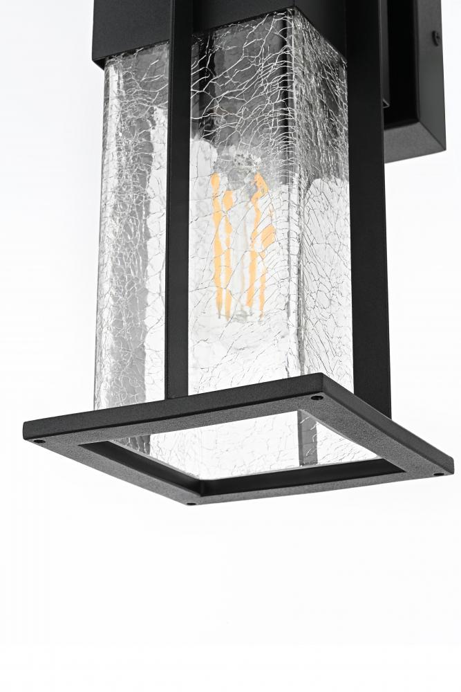Enhance the ambiance of your outdoor space with this distinctive wall sconce, crafted from durable iron and encased in clear, crackled glass panels. Its bold, geometric frame seamlessly combines modern lines with industrial touches, making it the perfect accent for any entryway, patio, or garden. The cracked glass effect adds visual intrigue and soft diffusion of light, creating a welcoming atmosphere. Featuring an E26 socket, it provides versatility for any standard bulb, while the sturdy construction ensures longevity against weather elements. This wall sconce not only lights up the night but also serves as an architectural statement, perfect for both modern and transitional exterior designs.