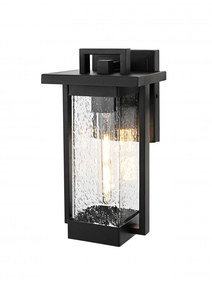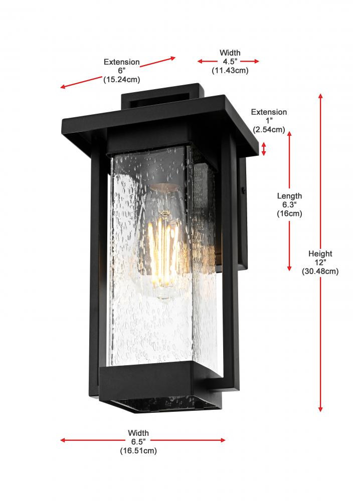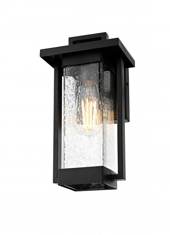 Transform your outdoor space with this striking iron and glass wall sconce, where classic design meets modern functionality. Crafted from durable iron, this sconce exudes a sturdy and timeless appeal, while the textured glass panes add visual depth, creating a glowing ambiance perfect for any exterior setting. The light fixture beautifully combines clean lines and soft accents, making it ideal for both traditional and modern homes. Its rugged black finish complements various decor styles, while the seeded glass subtly diffuses the light, delivering a warm and inviting glow that enhances curb appeal and nighttime visibility. Designed with durability in mind, this sconce is built to withstand the elements, making it a perfect lighting solution for patios, entryways, and gardens.