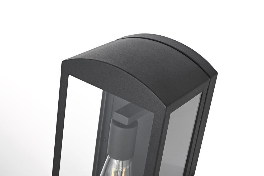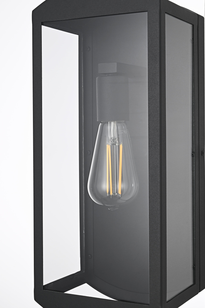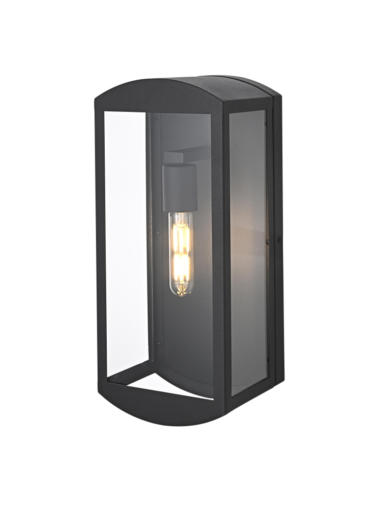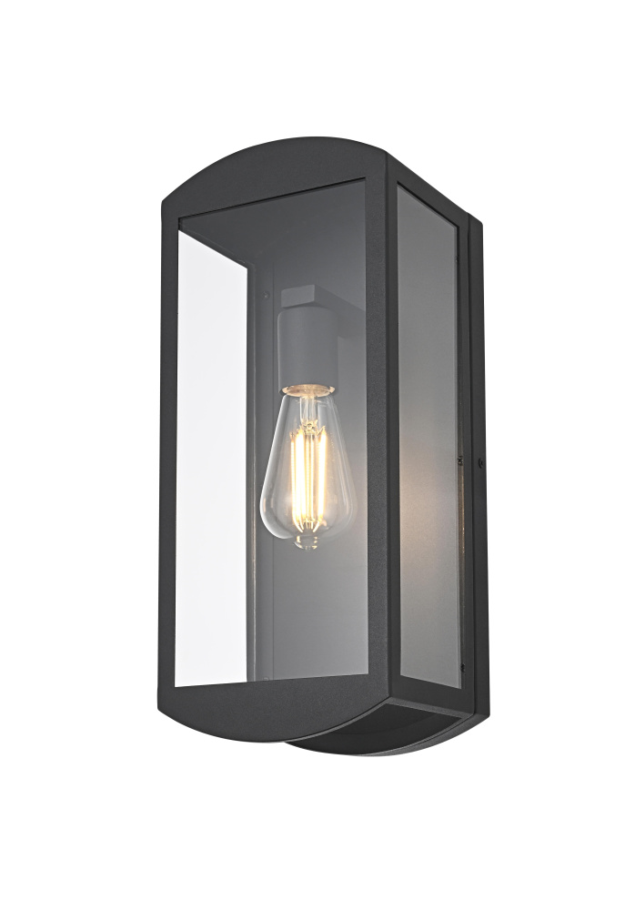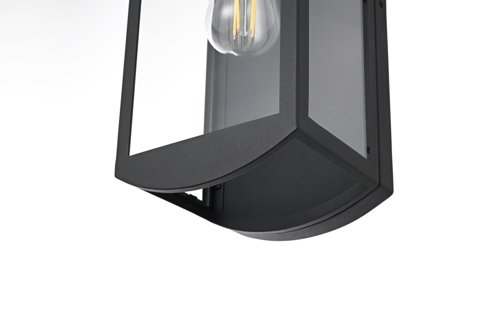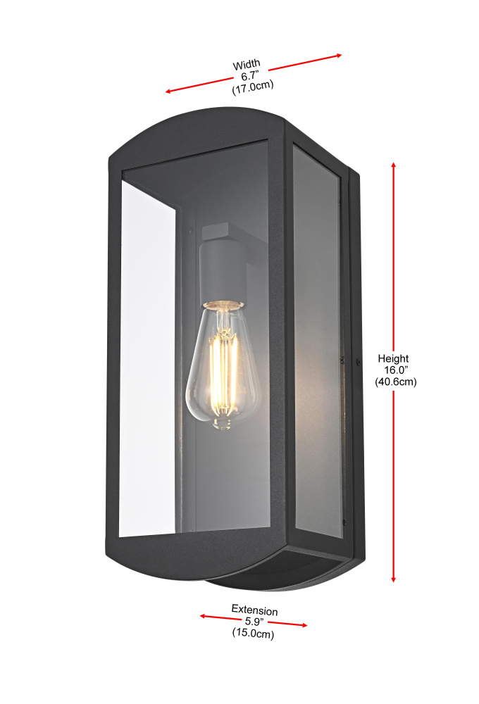 Make a statement with this striking outdoor wall light, where geometric structure meets graceful curves. The sleek iron frame is finished in a bold matte black, complementing the clear glass panels that allow for maximum illumination. The softly arched top and bottom add a refined touch, balancing sharp angles with smooth contours for a dynamic yet timeless look. Designed with an E26 socket (bulb not included), this fixture offers versatile lighting options to match your outdoor ambiance. The open-bottom design ensures easy bulb replacement, while the wet-rated construction guarantees durability in all weather conditions. Perfect for patios, entryways, and exterior walls, this wall light brings both functionality and modern elegance to any outdoor setting.