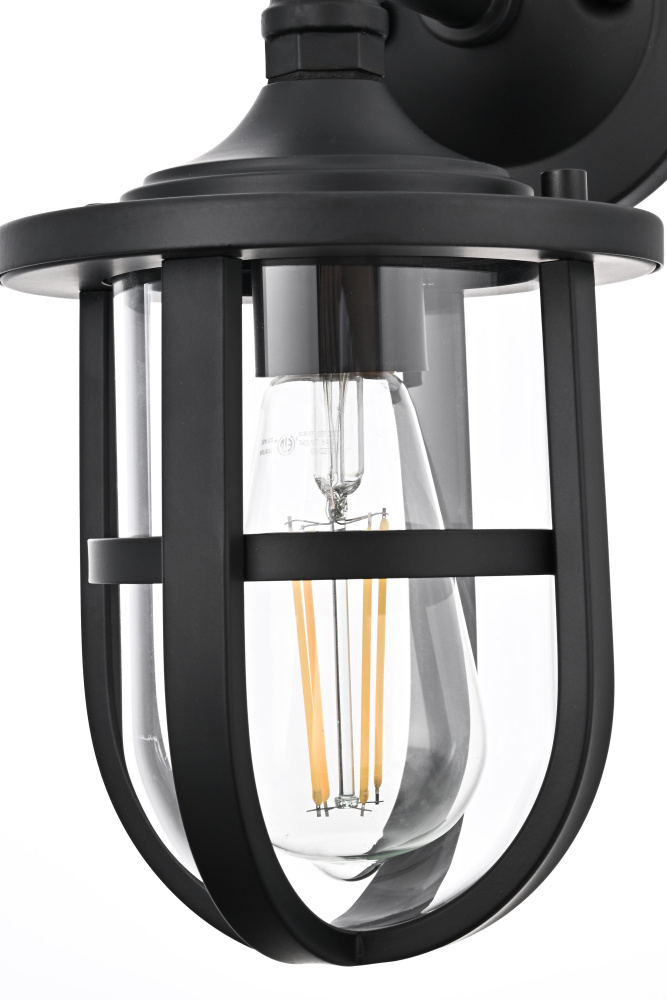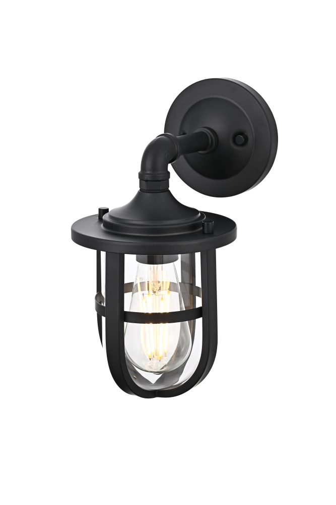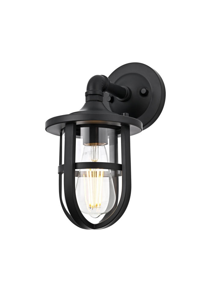 Bring industrial character and durable functionality to any outdoor space with a rugged wall light that merges bold design with practical illumination. A sturdy matte black frame encases a clear glass cylinder, allowing light to shine freely while maintaining a refined, structured appearance. The protective cage adds a layer of strength and visual interest, making this fixture perfect for porches, garages, and entryways. A pipe-inspired curved arm extends from the circular backplate, lending a factory-style aesthetic that blends seamlessly with farmhouse, nautical, and industrial settings. Designed with an E26 socket (bulb not included), this wet-rated wall light is built to withstand the elements, ensuring year-round performance in any climate. Whether paired with an Edison bulb for vintage appeal or a bright LED for crisp illumination, this bold outdoor sconce delivers both style and function to exterior spaces.