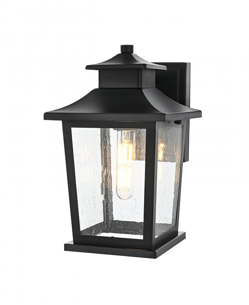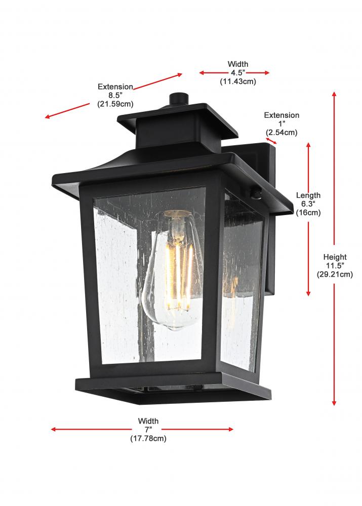 Add a timeless appeal to your exterior with this sophisticated outdoor wall sconce. Crafted from sturdy iron and glass, this wall sconce features a classic lantern-inspired design with clean lines and clear seeded glass panels that add both form and function to your outdoor space. Its matte black finish beautifully contrasts with the bright glow from the E26 bulb, creating a warm and welcoming ambiance for any entryway, porch, or patio. The open base design ensures effortless bulb replacement while the robust materials provide durability, even in changing weather conditions. This wall sconce is perfect for those who want to enhance their outdoor decor with a fixture that showcases both contemporary charm and vintage flair.