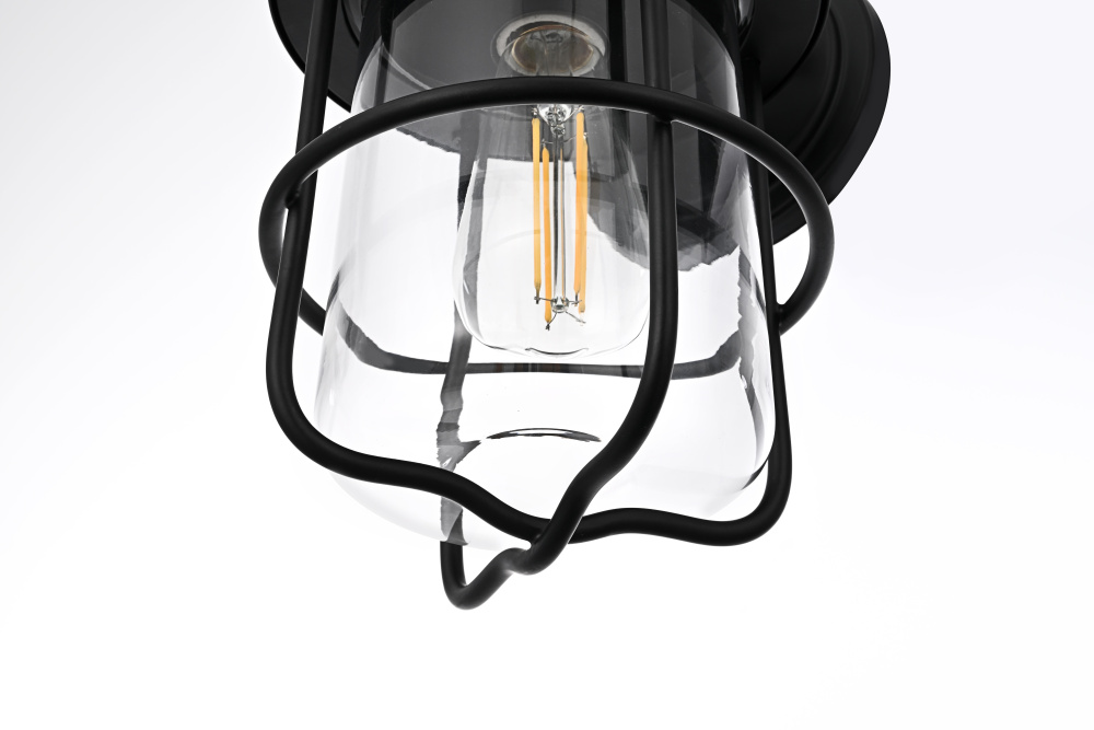 Enhance outdoor spaces with a wall light that blends industrial strength with vintage-inspired charm. A sturdy metal frame, finished in matte black, surrounds a clear glass enclosure, allowing bright, unobstructed illumination for porches, entryways, and garages. A protective cage adds durability while reinforcing the lantern’s rugged aesthetic, making it a stylish yet practical choice for exterior lighting. The rounded cap with subtle tiered detailing softens the overall look, offering a refined touch to its structured form. Designed with an E26 socket (bulb not included), this wet-rated wall light withstands the elements while delivering a timeless glow. Whether paired with an Edison bulb for vintage appeal or a bright LED for energy efficiency, this outdoor sconce offers both striking design and functional performanc