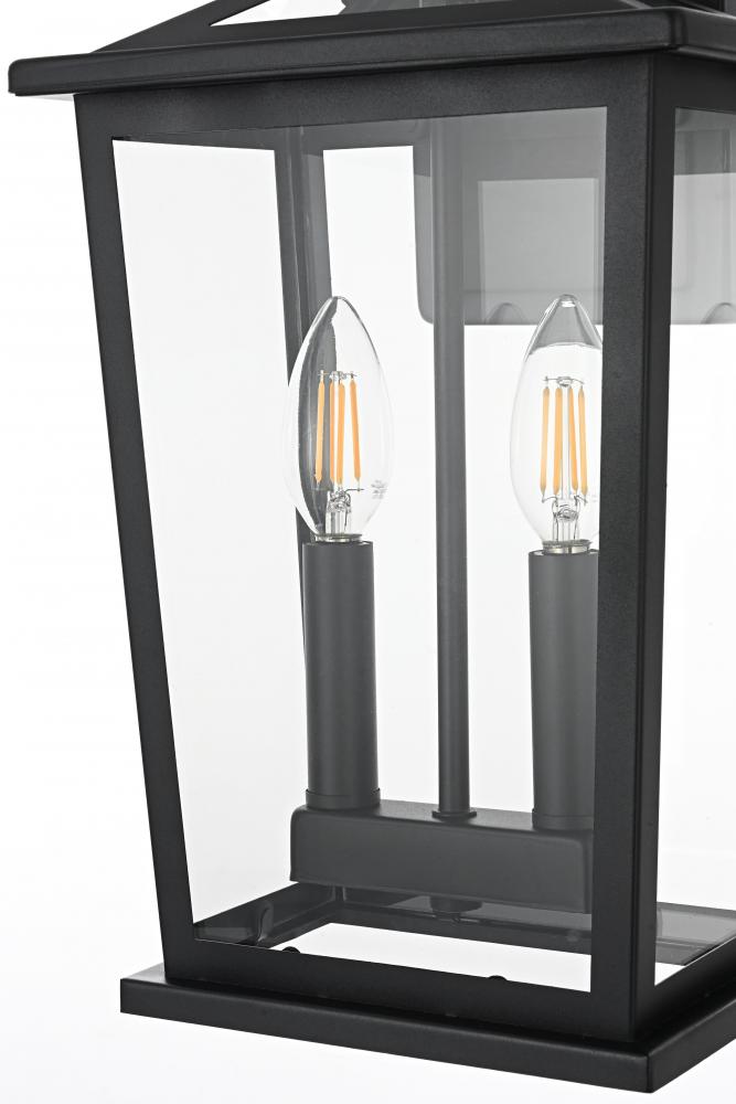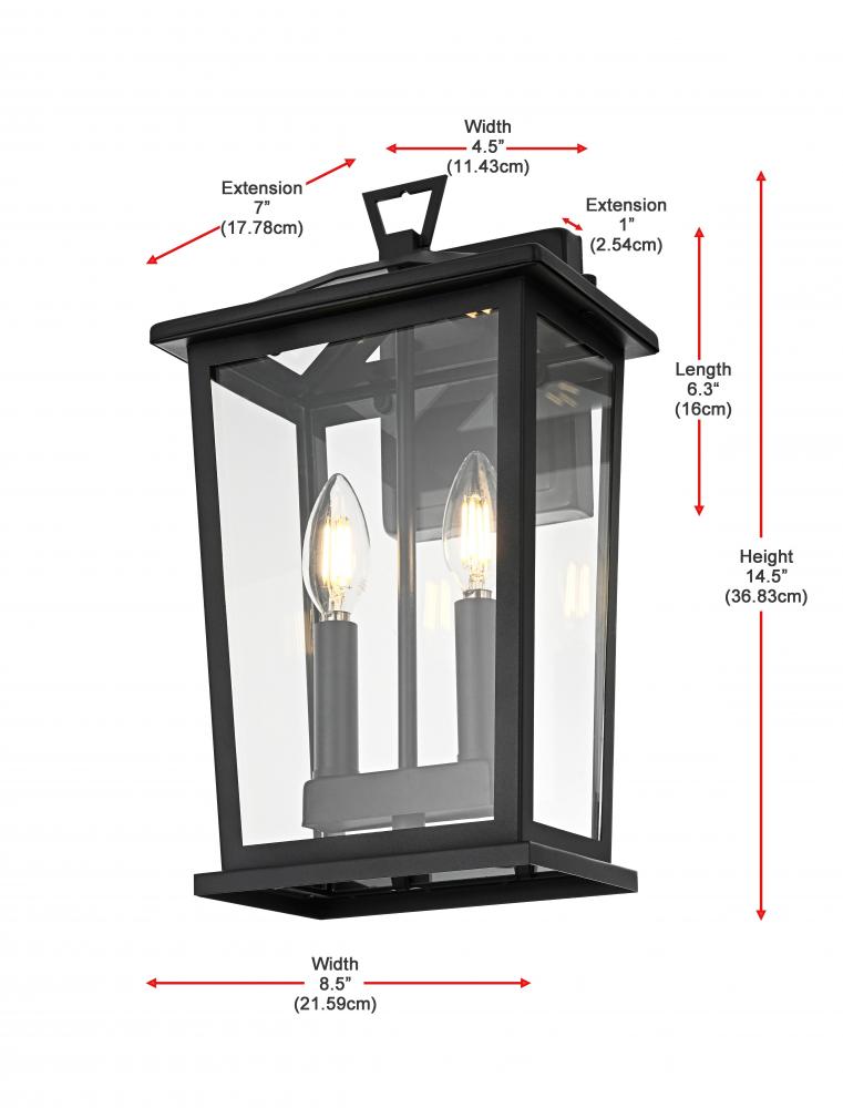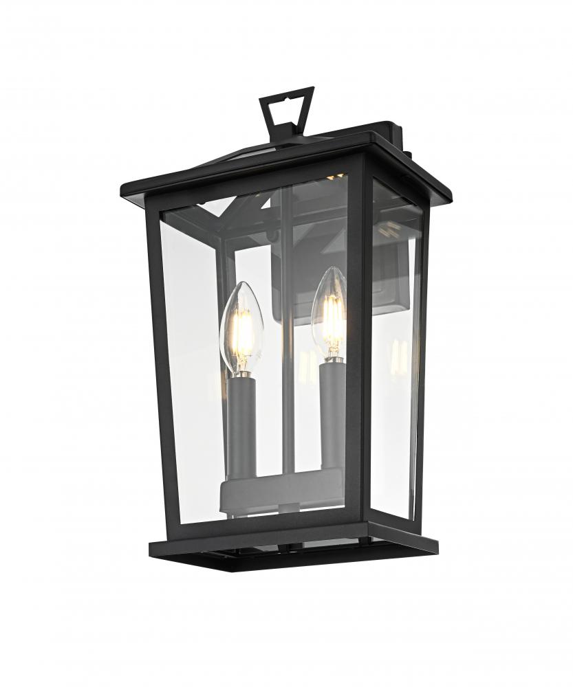 Enhance your outdoor space with this stylish wall sconce that features a striking matte black frame paired with clear glass panels, perfectly showcasing its modern charm. The latern box shape is adorned with a distinctive triangular loop on top, adding a unique architectural touch that seamlessly combines functionality with a bold, sleek aesthetic. The open bottom design allows for easy bulb changes and casts a beautiful downward light, adding a welcoming glow to your entrance or patio area. Crafted from durable iron with a clean, modern style, this wall sconce is perfect for those who appreciate a blend of simplicity and contemporary design. The clear glass ensures maximum light output, enhancing visibility while emphasizing the beautiful shape of the bulb inside. The E12 socket offers versatility for different bulb styles, allowing you to easily customize the ambiance of your outdoor area.