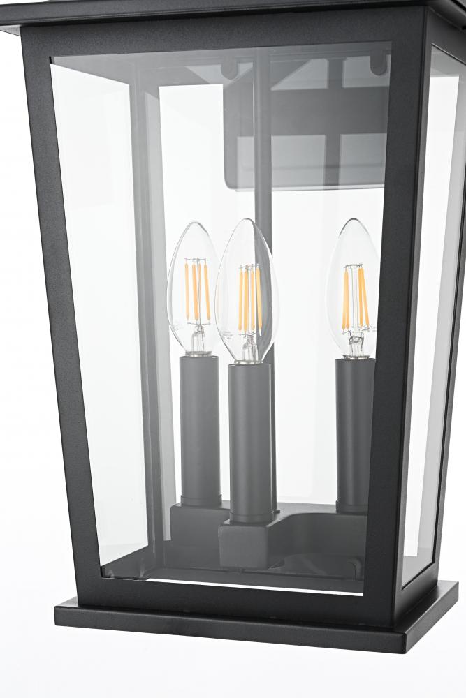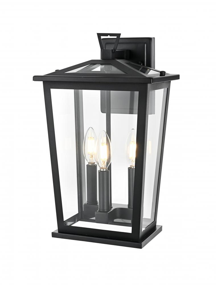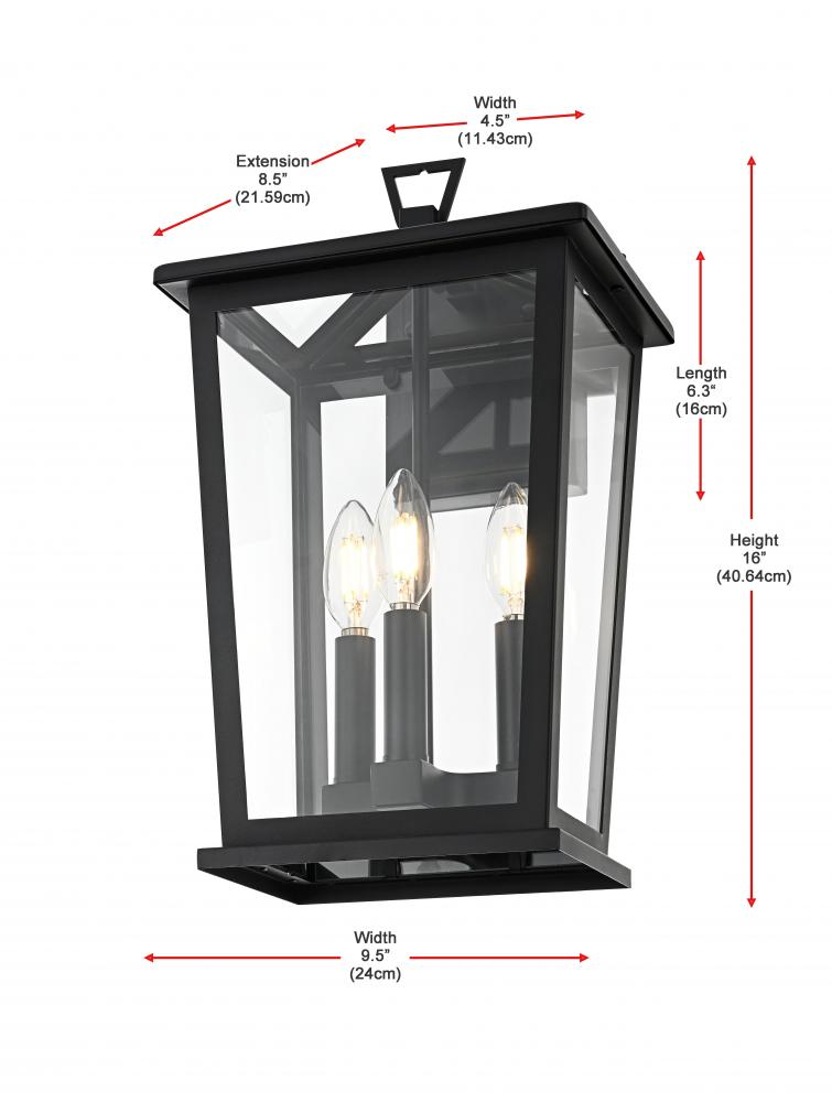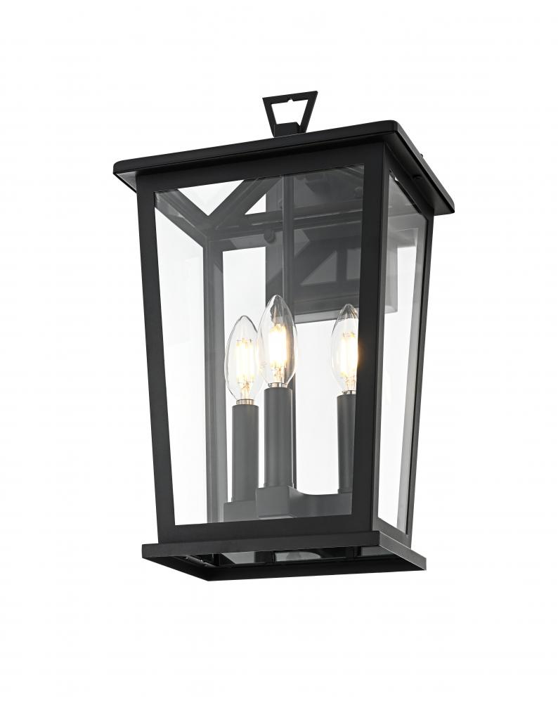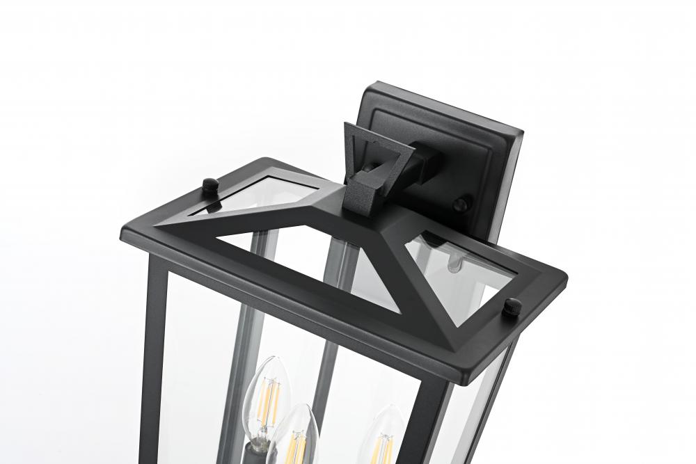Enhance your outdoor space with this stylish wall sconce that features a striking matte black frame paired with clear glass panels, perfectly showcasing its modern charm. The latern box shape is adorned with a distinctive triangular loop on top, adding a unique architectural touch that seamlessly combines functionality with a bold, sleek aesthetic. The open bottom design allows for easy bulb changes and casts a beautiful downward light, adding a welcoming glow to your entrance or patio area. Crafted from durable iron with a clean, modern style, this wall sconce is perfect for those who appreciate a blend of simplicity and contemporary design. The clear glass ensures maximum light output, enhancing visibility while emphasizing the beautiful shape of the bulb inside. The E12 socket offers versatility for different bulb styles, allowing you to easily customize the ambiance of your outdoor area.