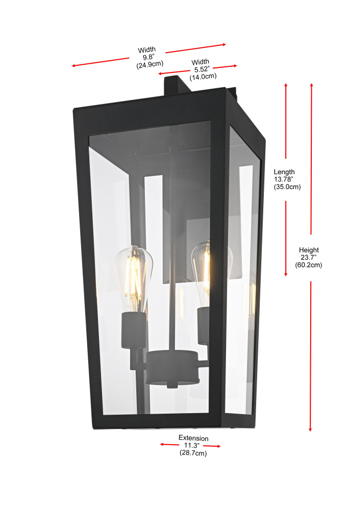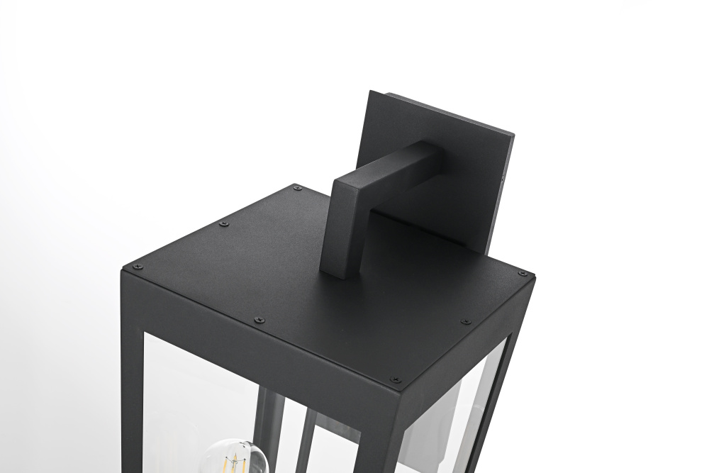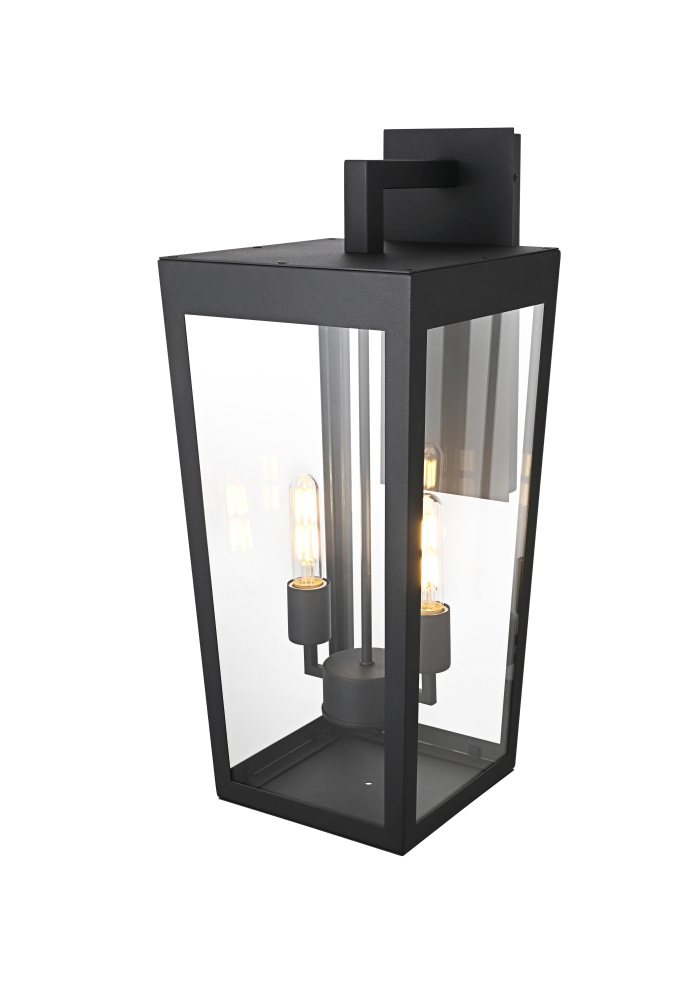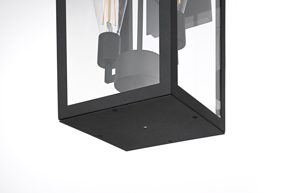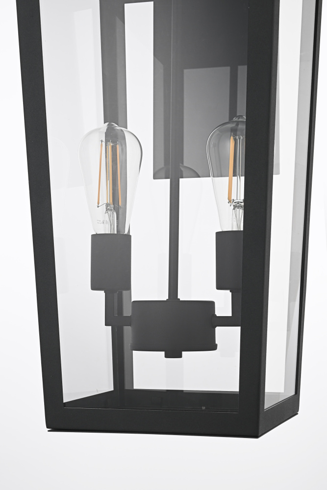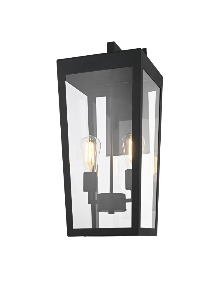 Elevate your outdoor lighting with this sleek, modern wall fixture, designed with a refined tapered silhouette and clear glass panels for an airy, sophisticated look. Constructed from durable iron with a floating mount detail, this fixture blends architectural precision with minimalist appeal. The enclosed bottom, secured with a metal plate, adds structural integrity while maintaining a streamlined, finished design. Featuring two standard E26 socket (bulb not included), this light allows for customization in brightness and style. Wet rated for durability against outdoor elements, it is perfect for entryways, patios, and exterior walls. The matte black finish enhances its bold frame, making it a striking statement piece that seamlessly balances form and function.