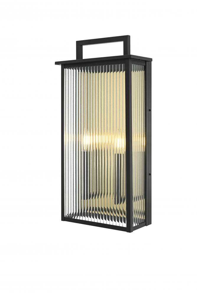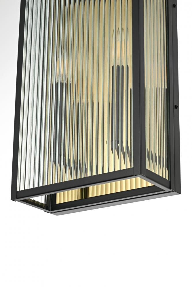 Transform your outdoor space with this stunning wall light that pairs durability with striking design. The sleek iron frame is complemented by vertically ribbed glass panels, creating a unique interplay of light and shadow. The standout feature? A gold backplate that adds a luxurious touch, reflecting a warm glow and contrasting beautifully with the matte black frame. with multiple candelabra-style bulbs and weather-resistant construction, this fixture is not only functional but a true visual centerpiece for entryways, patios, or pathways. Make a statement with this captivating combination of modern design and radiant metallic accents.
