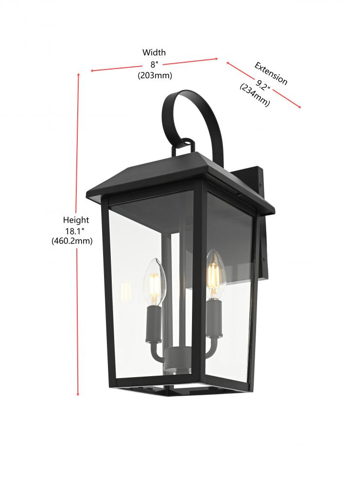 Enhance your home’s curb appeal with this striking outdoor wall sconce. Crafted from sturdy iron and framed with crystal-clear glass, this sconce embodies a bold rectangular lantern design that radiates classic charm. with two candelabra-style bulbs, it casts a warm, inviting glow, beautifully amplified by the clear glass panels. The matte black finish and curved arm detail add a touch of architectural refinement, while its weather-resistant design ensures lasting beauty. Perfect for entrances, patios, or walkways, this sconce lights the way in style.