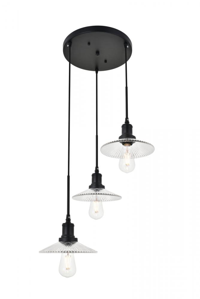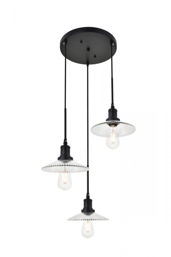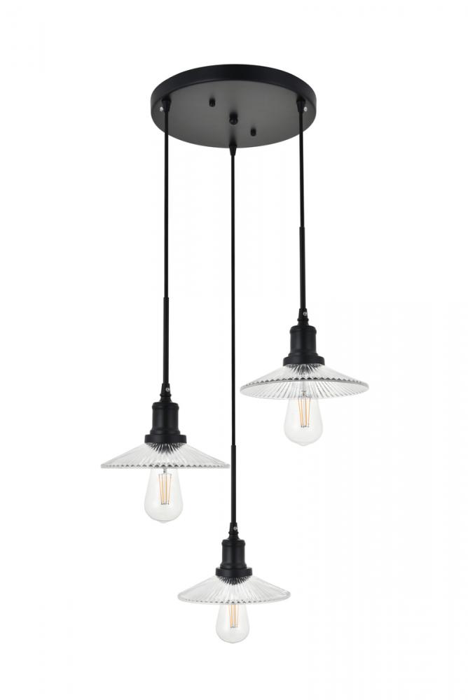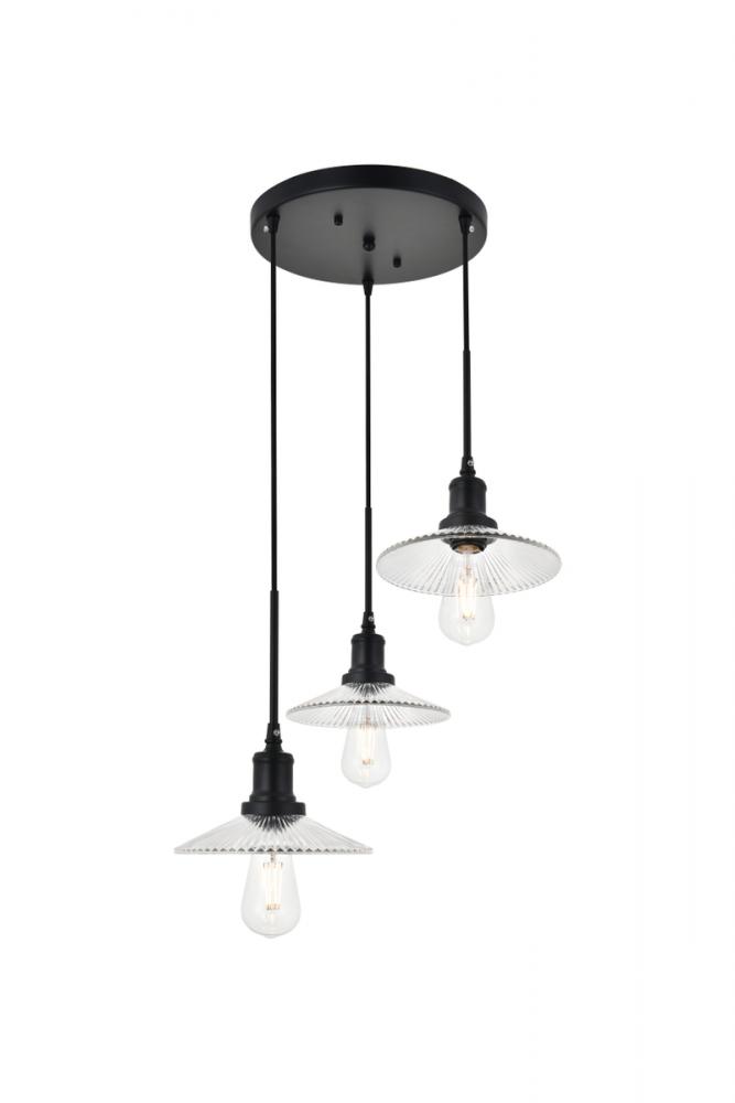 Black finish 3-light pendant light and short cone shaped shade hanging from a circular canopy