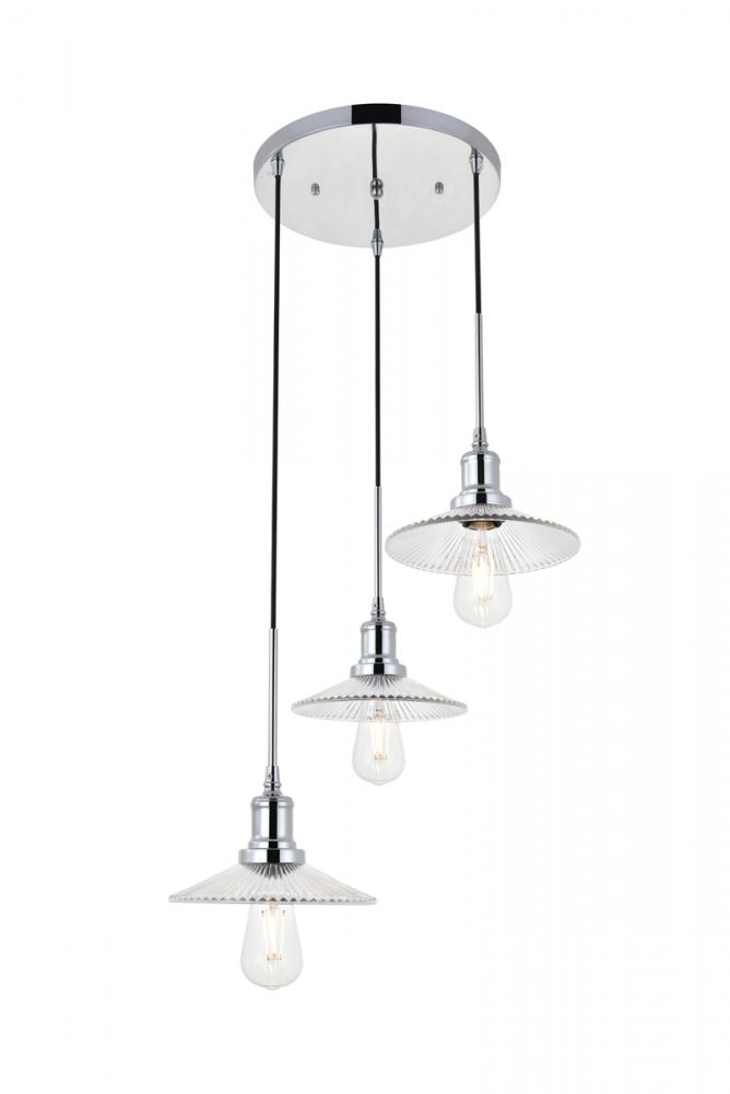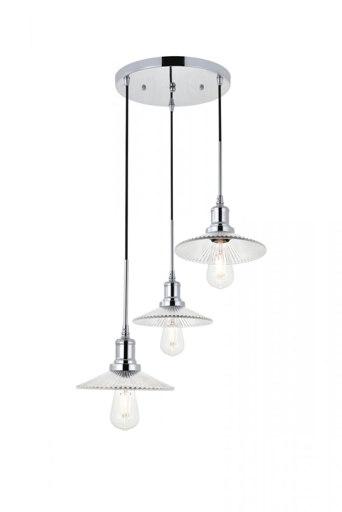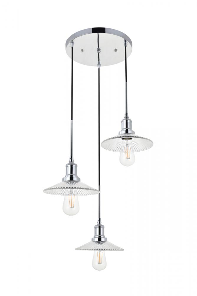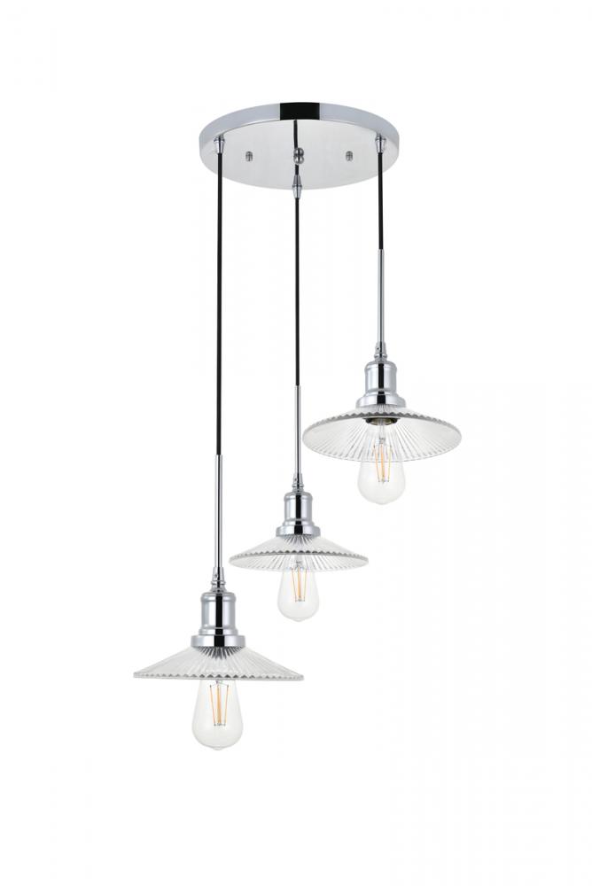 Chrome finish 3-light pendant light and short cone shaped shade hanging from a circular canopy
