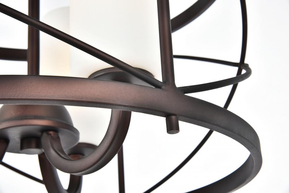 A playful composition with vintage appeal, Wren collection hanging fixtures are a unique blend of form and function. An oval Iron frame in a dark-copper brown finish connects to a stout chain and circular mounting fixture while Iron strips arch above and Iron Rods swirl around the sides. Nestled in the center, like eggs in a basket, three cylindrical frosted white Glass shades sit snugly atop curved arms. The perfect accompaniment for rustic or nautical décor in a living room, office, or bedroom.