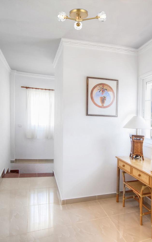 Hexagonal and pentagonal facets on the 4 inch crystal spheres tastefully diffuses the soft illumination from each arm