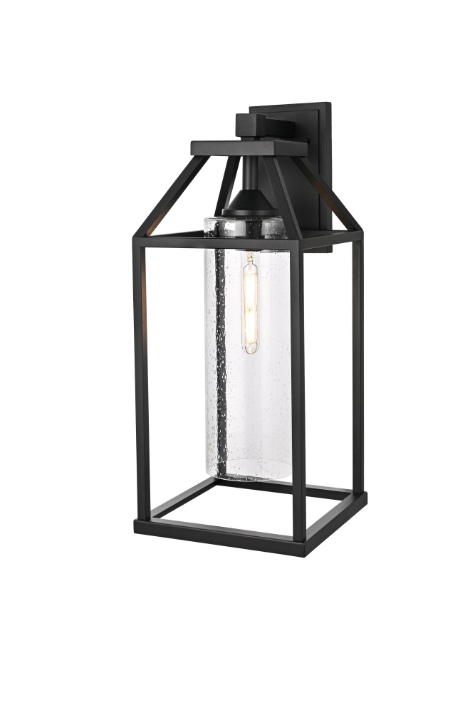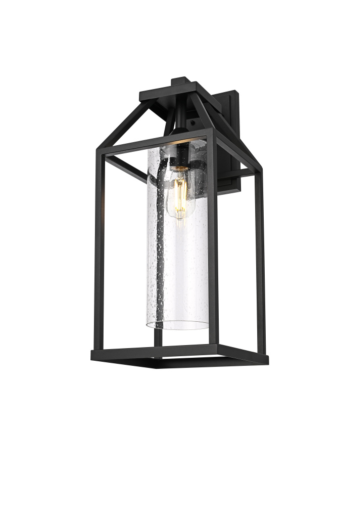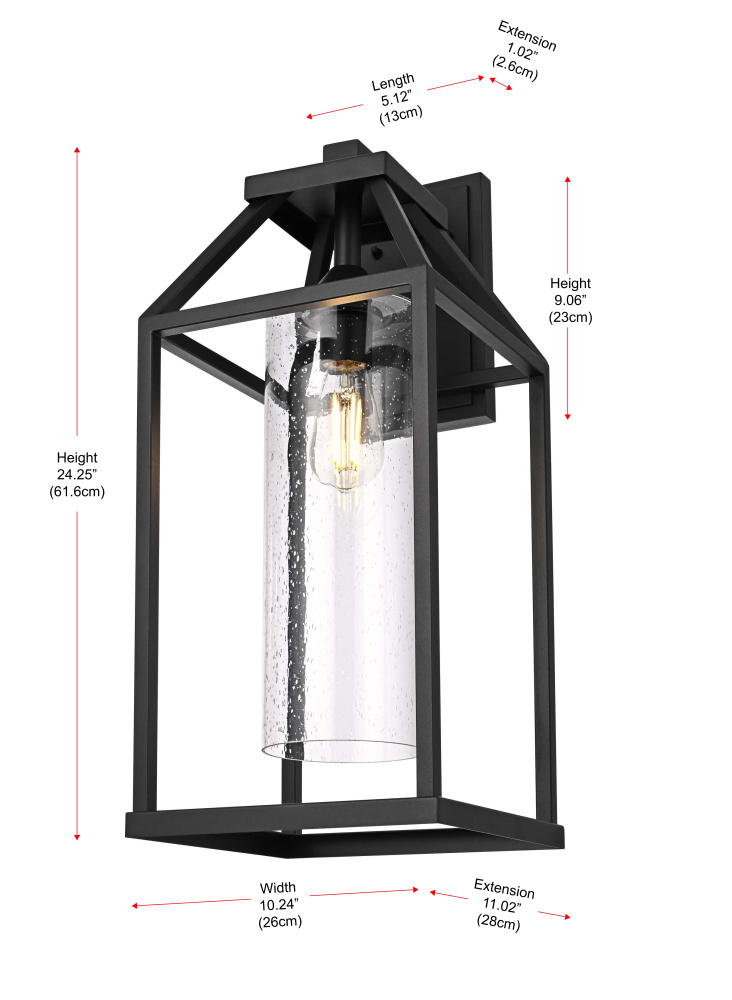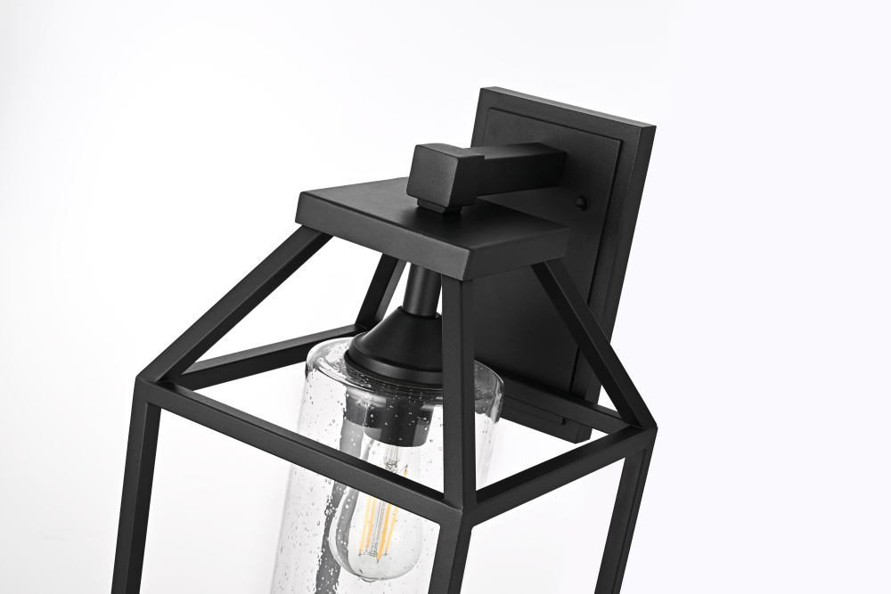 This outdoor wall light blends architectural structure with functional lighting, featuring a geometric open-frame design and a peaked top that gives it a bold, defined look. The clear seedy glass cylinder at the center allows the light to shine through while adding subtle texture and depth. Crafted from iron and aluminum, the durable black-finished frame ensures long-term performance in outdoor conditions and is ETL Wet Rated for reliability in entryways, patios, and garage exteriors. Available in 14-inch, 19-inch, and 24-inch heights, this fixture offers versatility to complement different outdoor spaces. The dimmable function allows for adjustable brightness when paired with a compatible dimmer, while the E26 medium-base socket (bulb not included) provides flexibility for different bulb styles. Pre-wired with a 7-inch lead, this wall light is a strong and stylish choice for enhancing outdoor spaces. Built with marine-grade, corrosion-resistant aluminum, this sconce withstands coastal conditions for long-lasting durability.