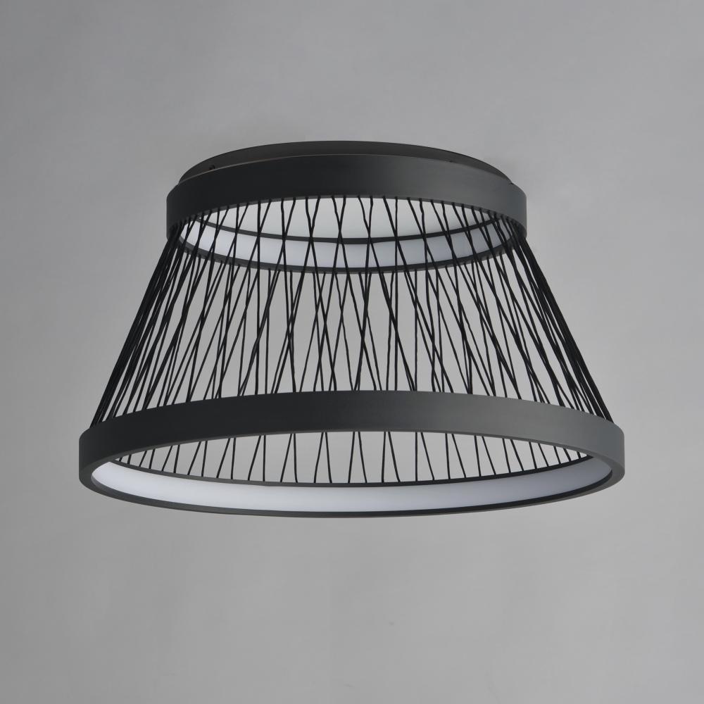 Cross-threaded strands of cotton are strung through two Matte Black illuminated rings of LED. The black cotton thread creates a form both structural and airy in composition. These pendants perfectly capture the art of weaving techniques by producing a larg