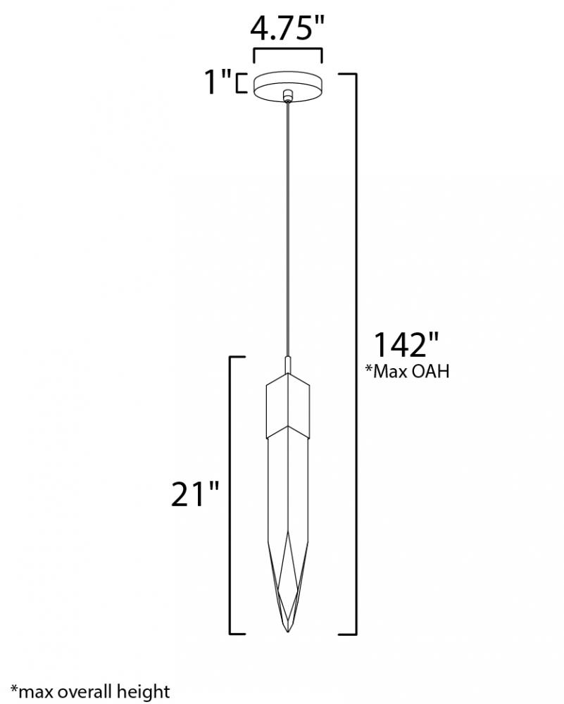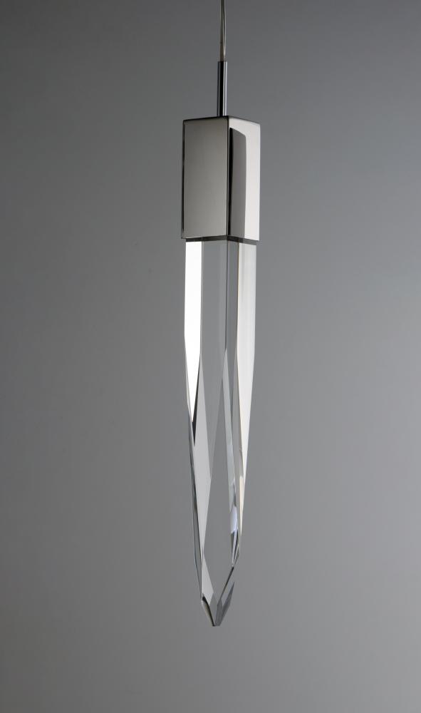 Stalactites of Clear Beveled crystal suspend from your choice of Polished Chrome or Black supports, can be hung at various heights to create a spectacular array. The crystal shimmers as light diffuses through the facets powered by 90 CRI LED dimmable modul