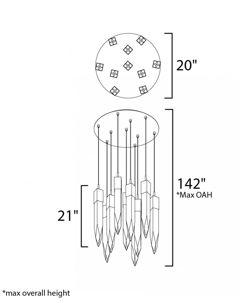 Stalactites of Clear Beveled crystal suspend from your choice of Polished Chrome or Black supports, can be hung at various heights to create a spectacular array. The crystal shimmers as light diffuses through the facets powered by 90 CRI LED dimmable modul