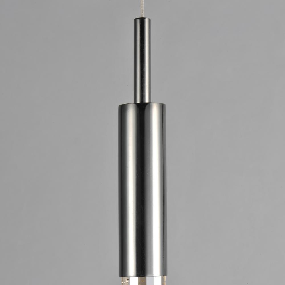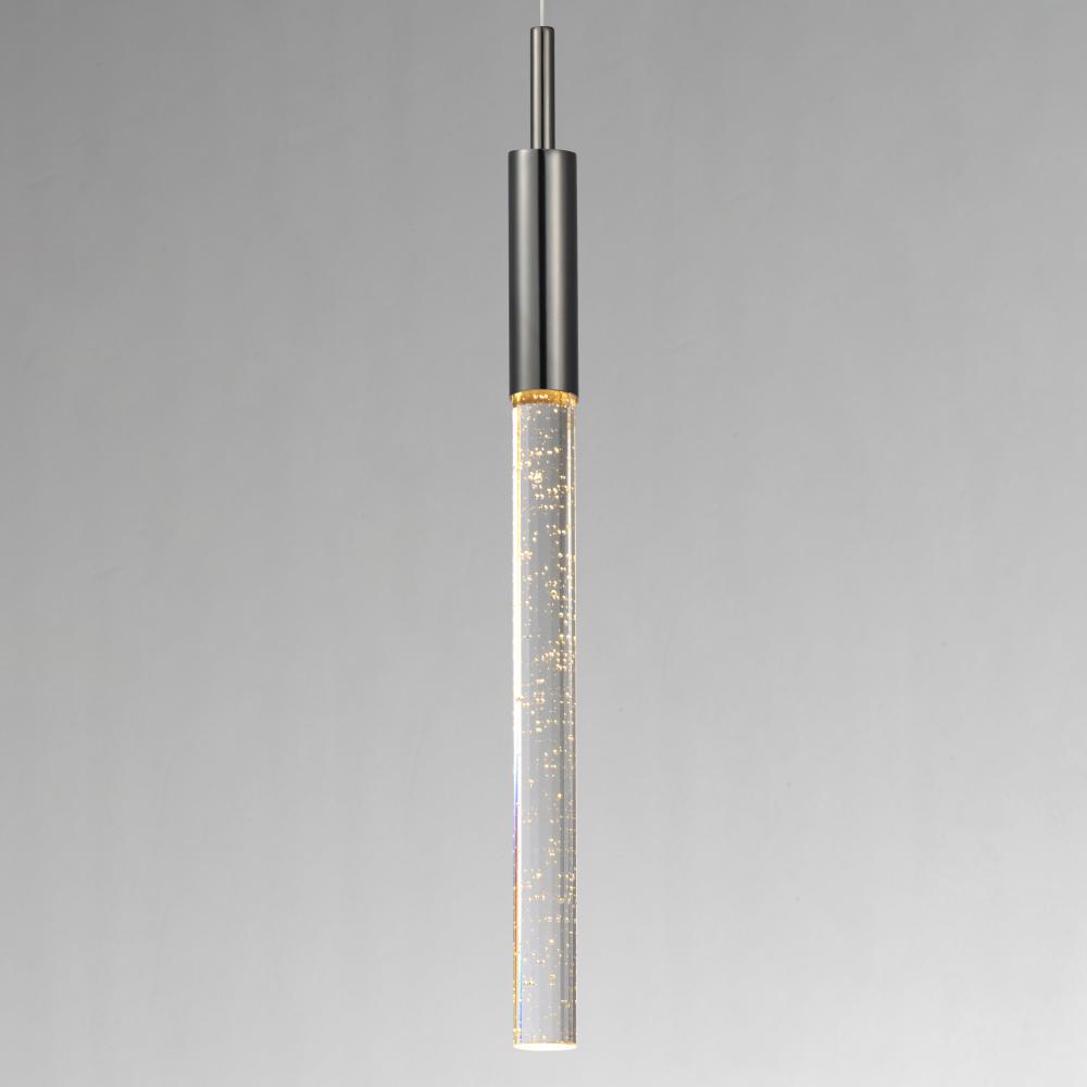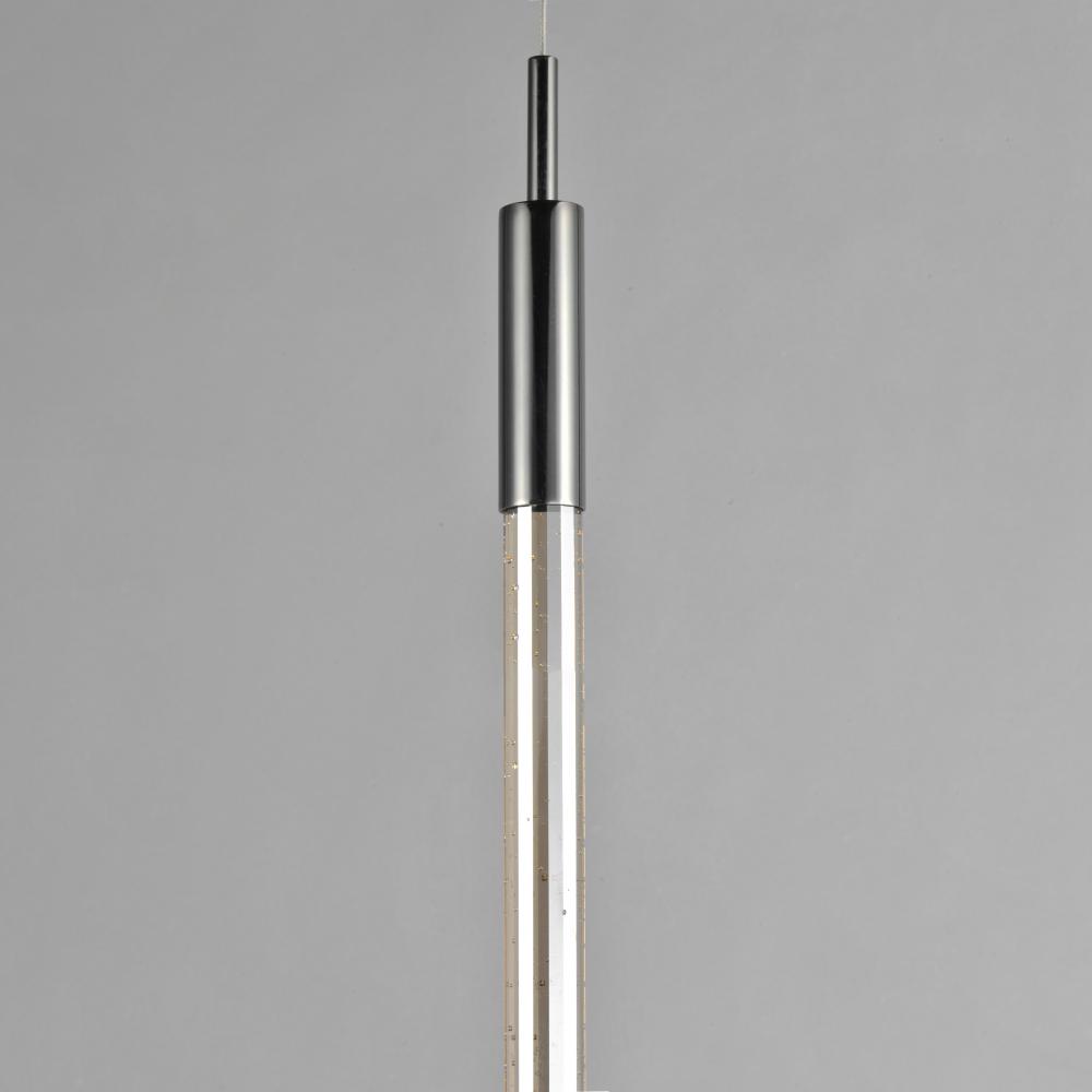 Slender beveled cut rods of bubble glass, illuminated by high power LED modules, suspend in an array of fashionable configurations. Available in Black Chrome with Clear bubble glass and Anodized Bronze with Champagne bubble glass.