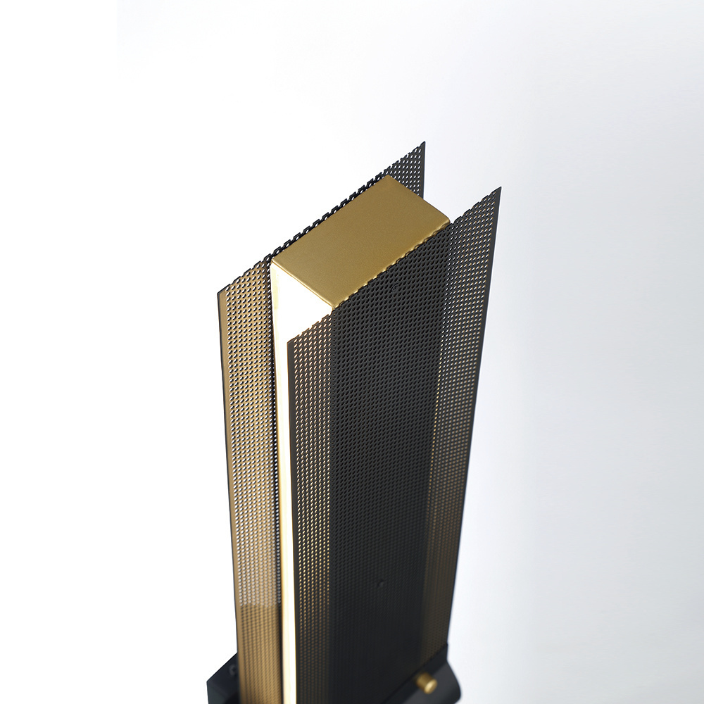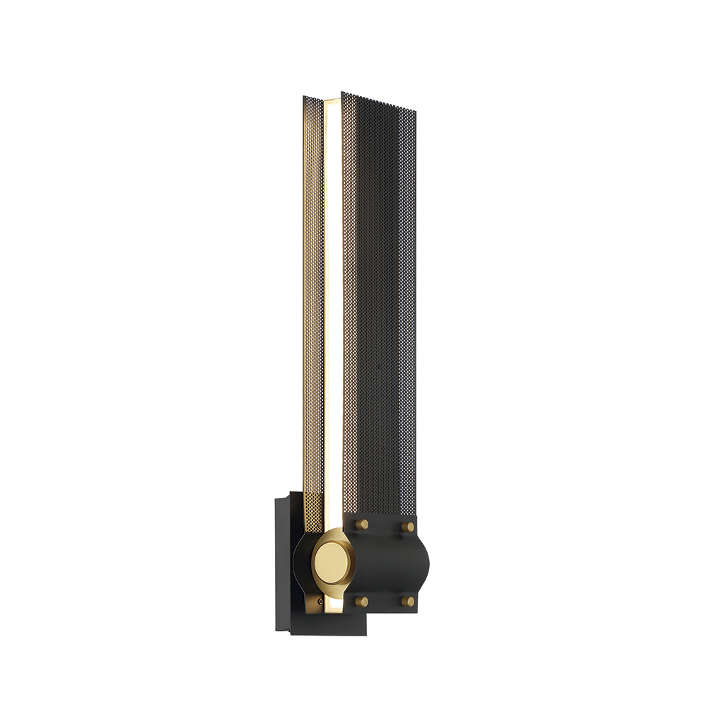 LED bands of integrated light beam through intricate filigreed metalwork that acts as a unique way to diffuse light. An inviting warmth radiates from this collection, highlighting matte black, rich brass, and decorative gold rivets with a dark perforated lens. This extensive family offers circular chandeliers, rectangular chandeliers and linear pendants, as well as a wall sconce that can be horizontal or vertical for endless applications.