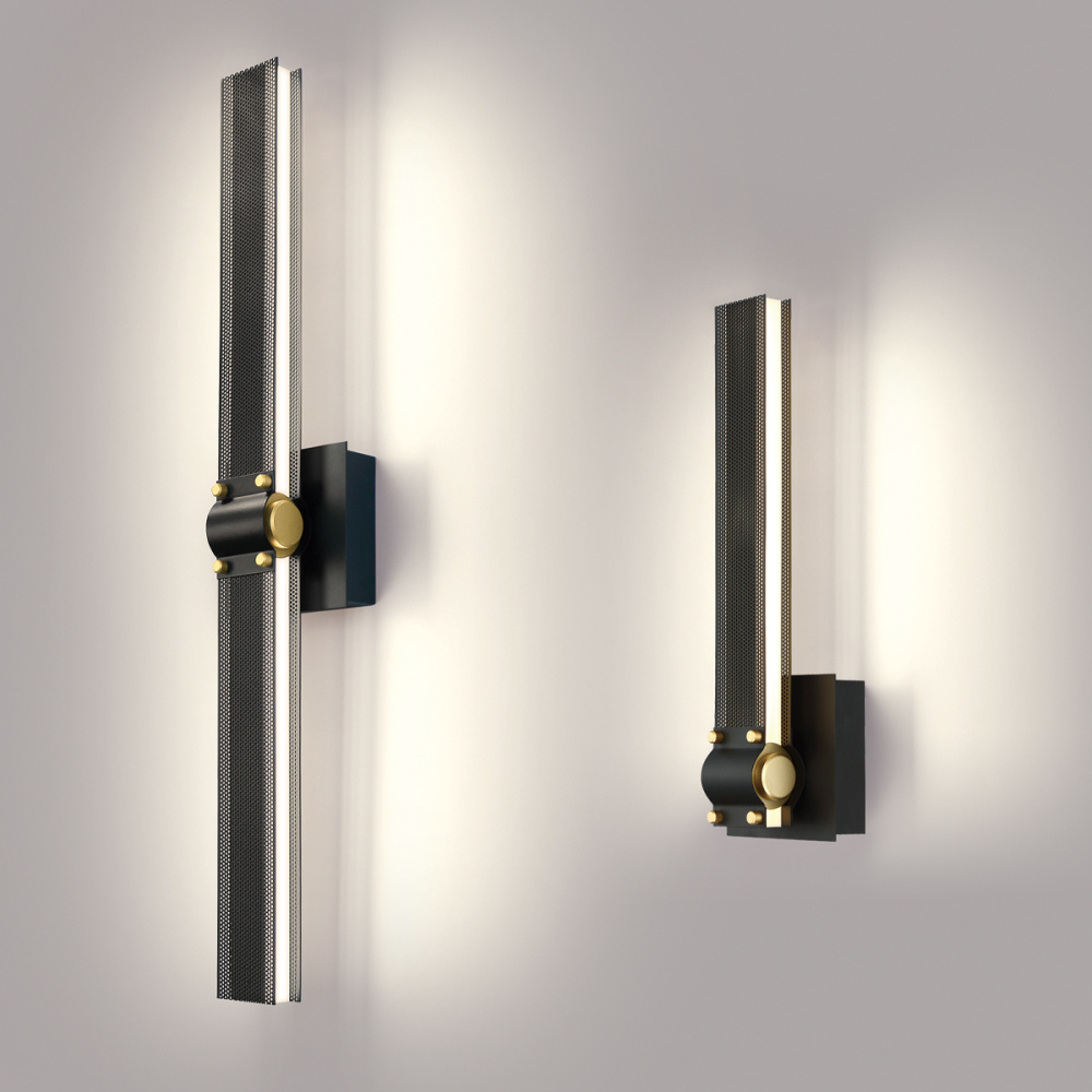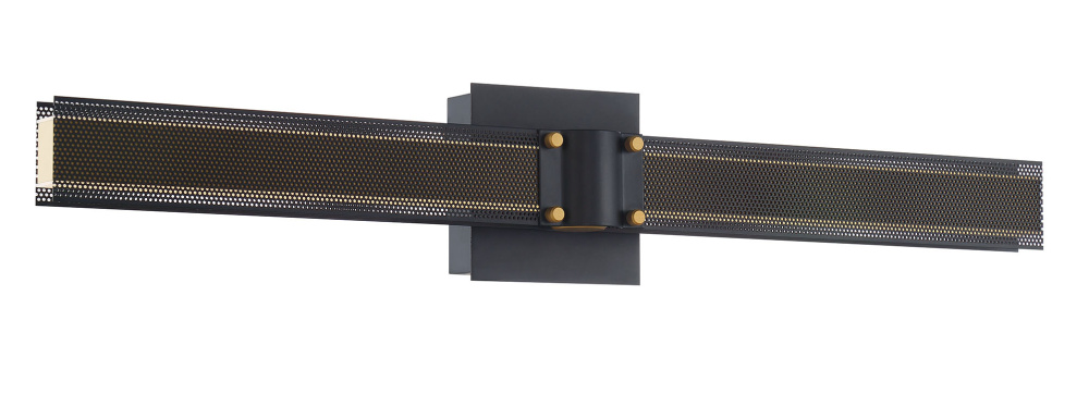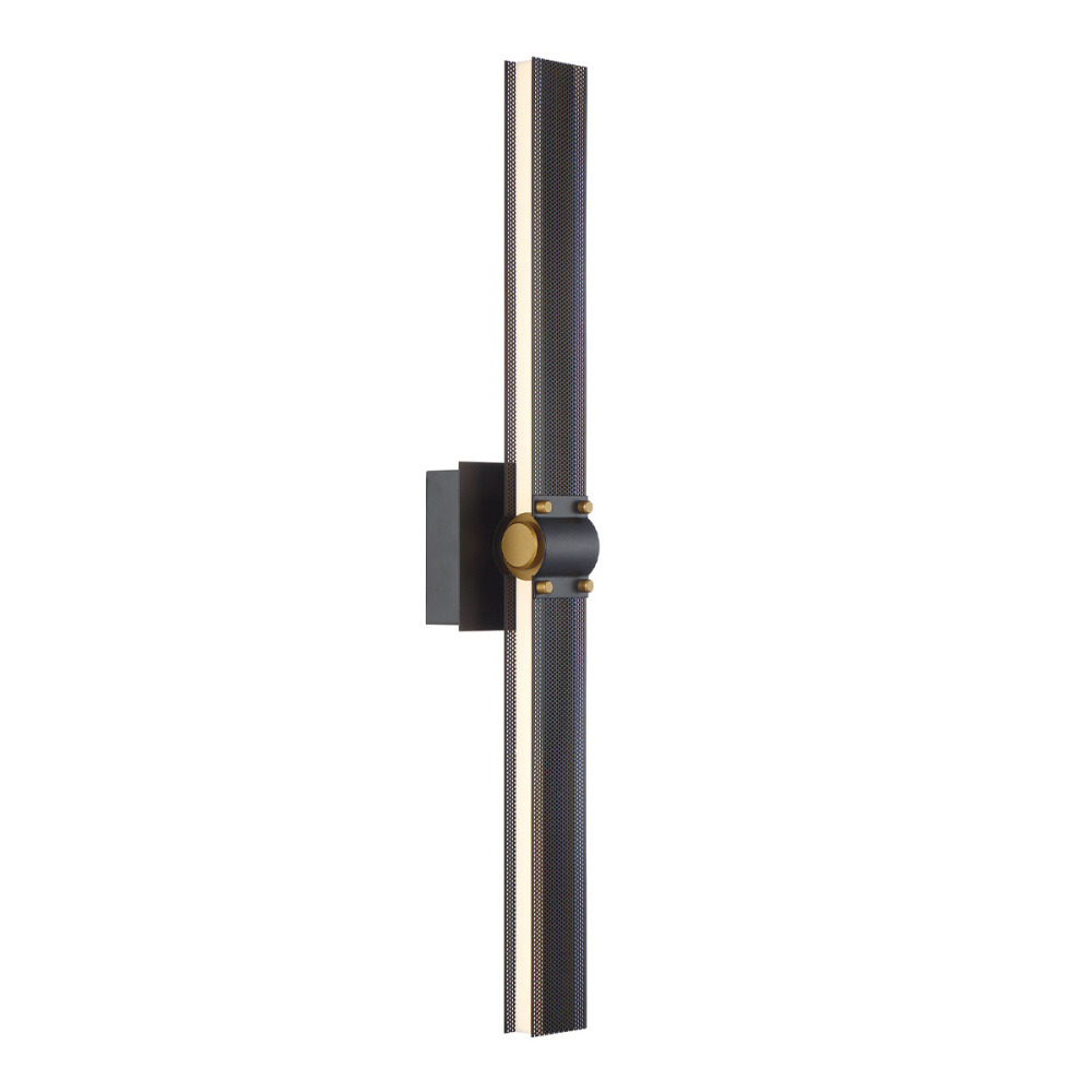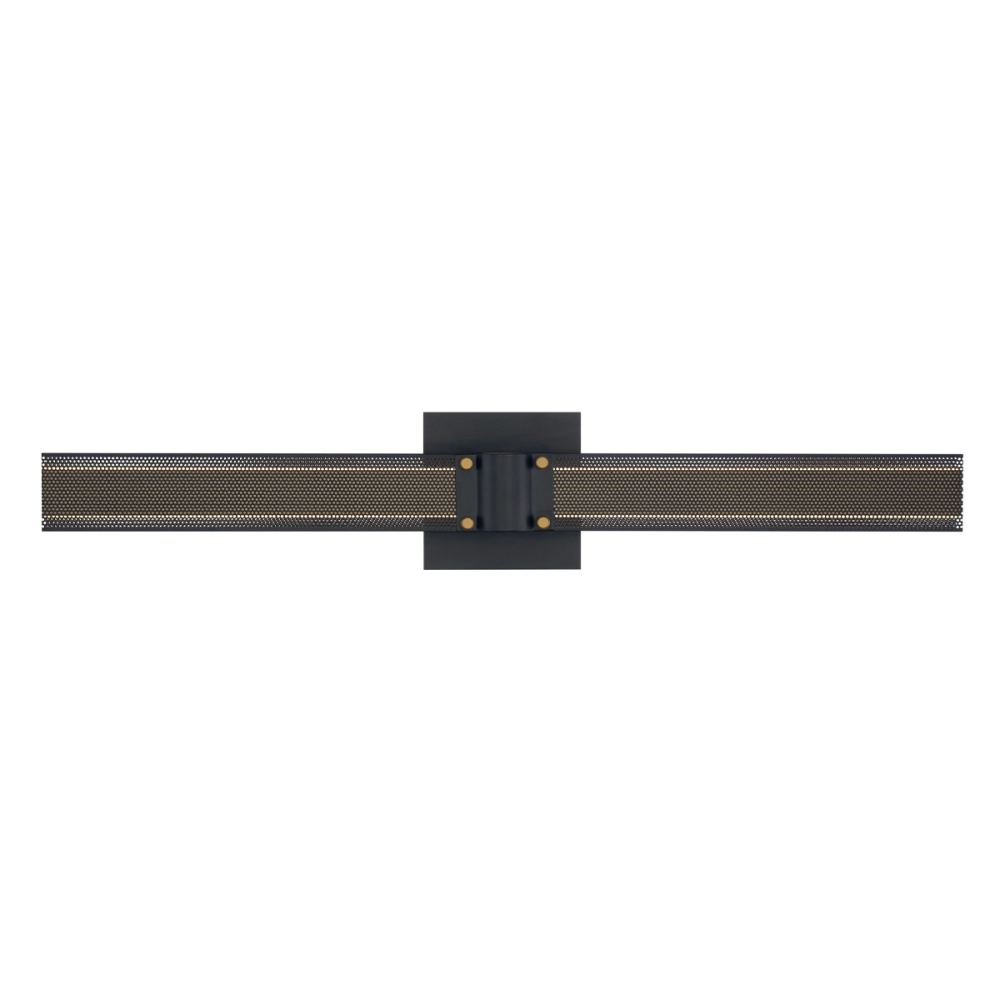 LED bands of integrated light beam through intricate filigreed metalwork that acts as a unique way to diffuse light. An inviting warmth radiates from this collection, highlighting matte black, rich brass, and decorative gold rivets with a dark perforated lens. This extensive family offers circular chandeliers, rectangular chandeliers and linear pendants, as well as a wall sconce that can be horizontal or vertical for endless applications.